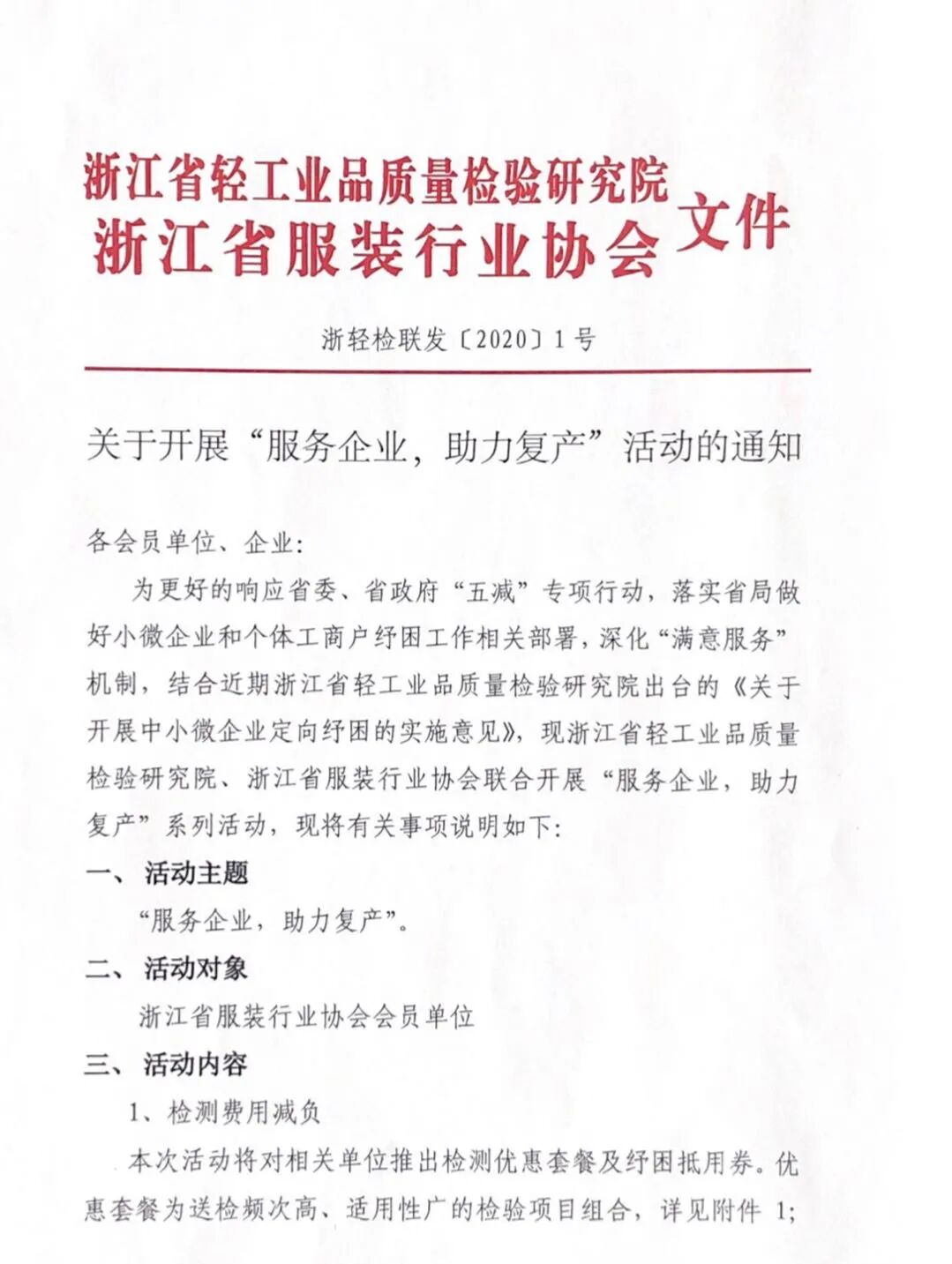 为更好响应省政府“五减”专项行动,深化服务机制,切实帮助会员企业减负纾困,协会特联合浙江省轻工业品质量检验研究院开展“服务企业,助力复产”系列活动,推出面向本会会员单位的服装质量检测优惠套餐及纾困抵用券。