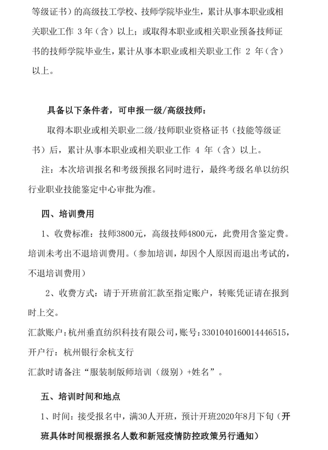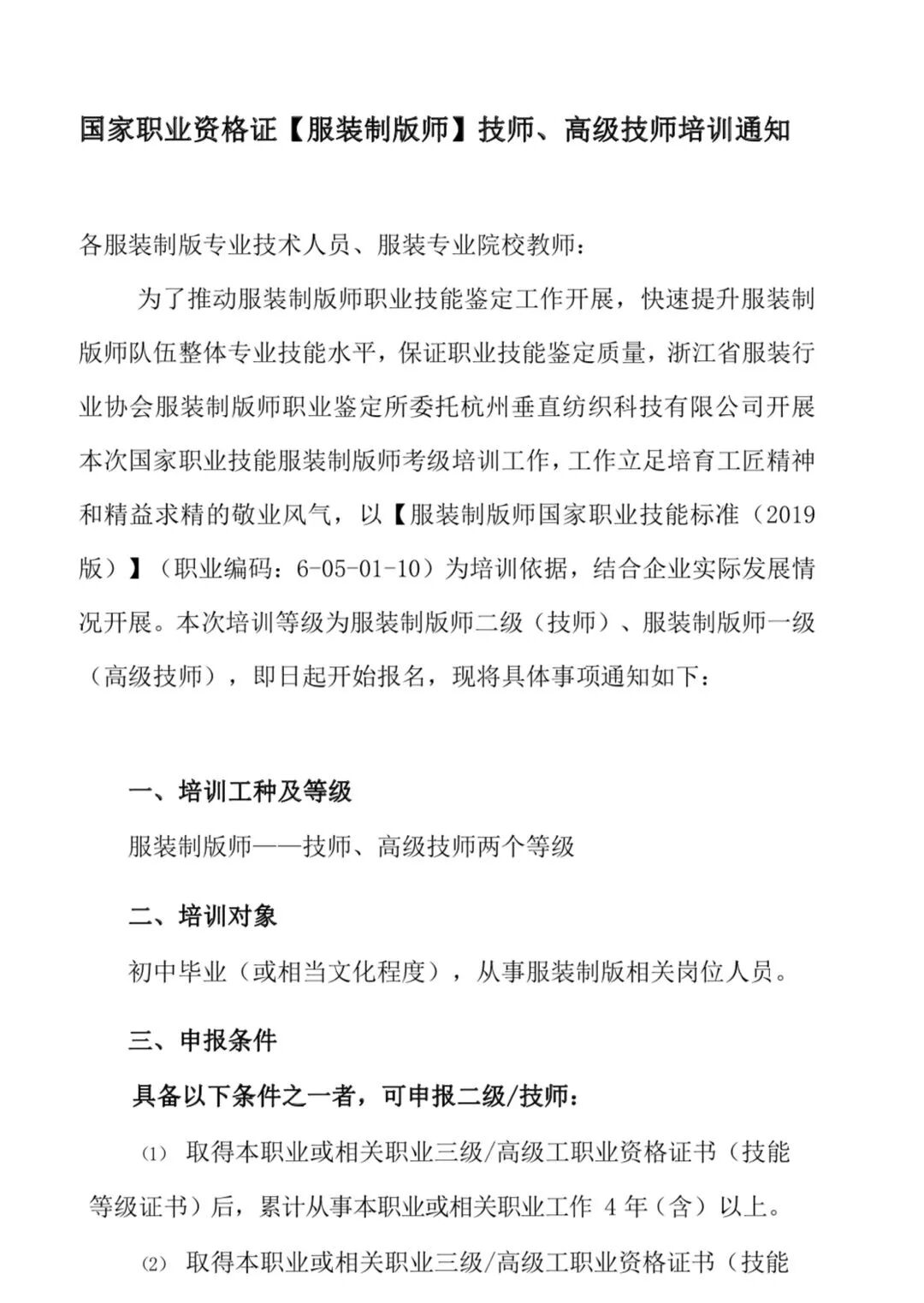 为了满足广大版师的需求,快速提升服装制版师队伍整体专业技能水平,提高服装制版师职业技能鉴定工作质量,浙江省服装行业协会服装制版师职业鉴定所特别委托杭州垂直纺织科技有限公司,计划近期开展服装制版师技师(二级)、高级技师(一级)的考证培训工作。即日起开始报名,现将具体事项通知如下: