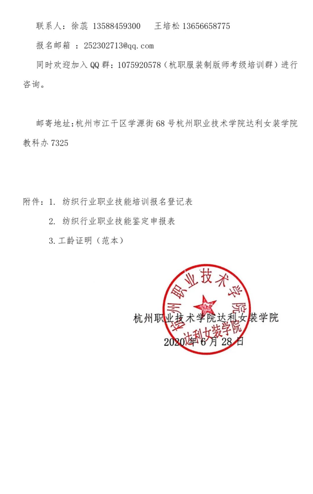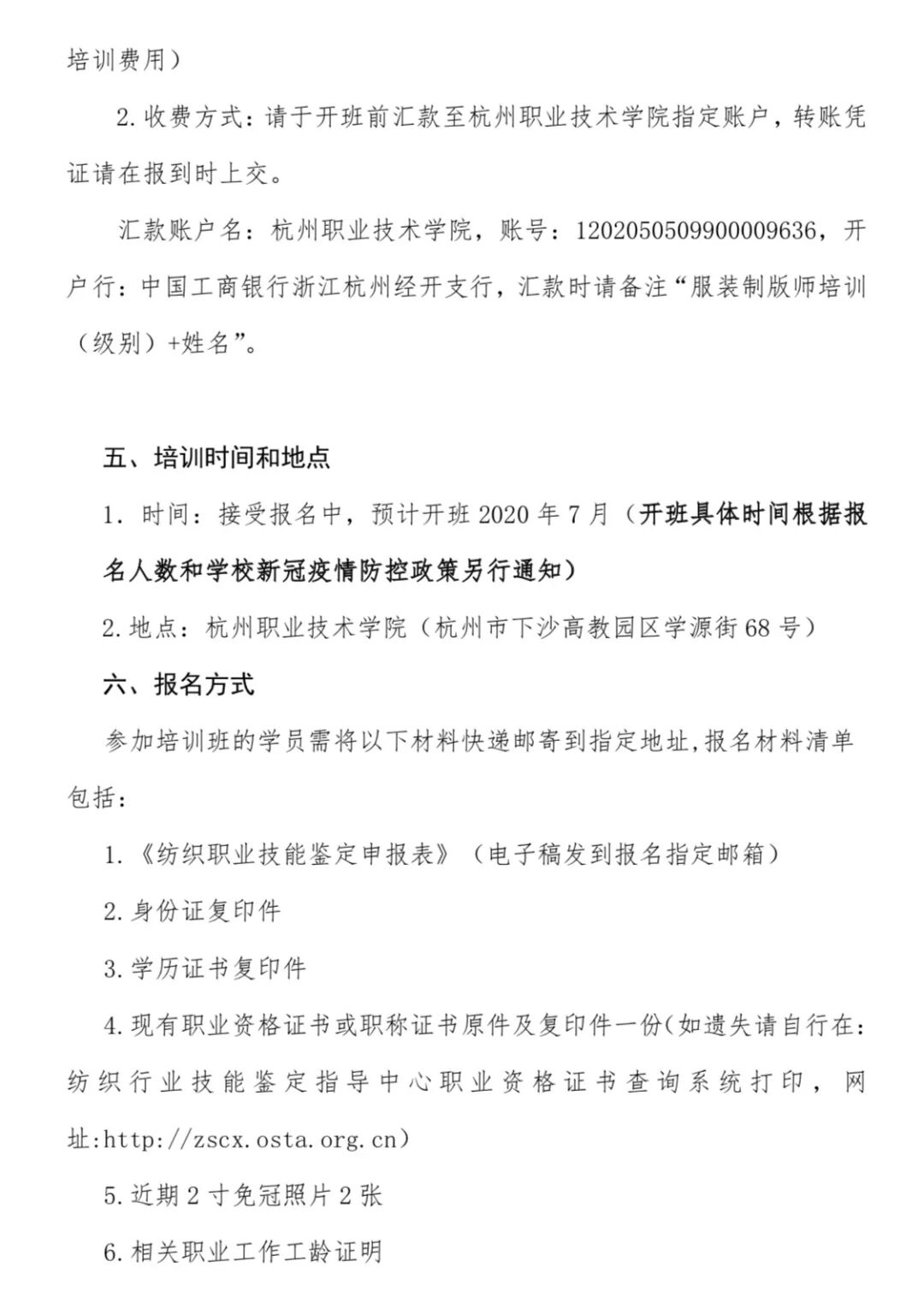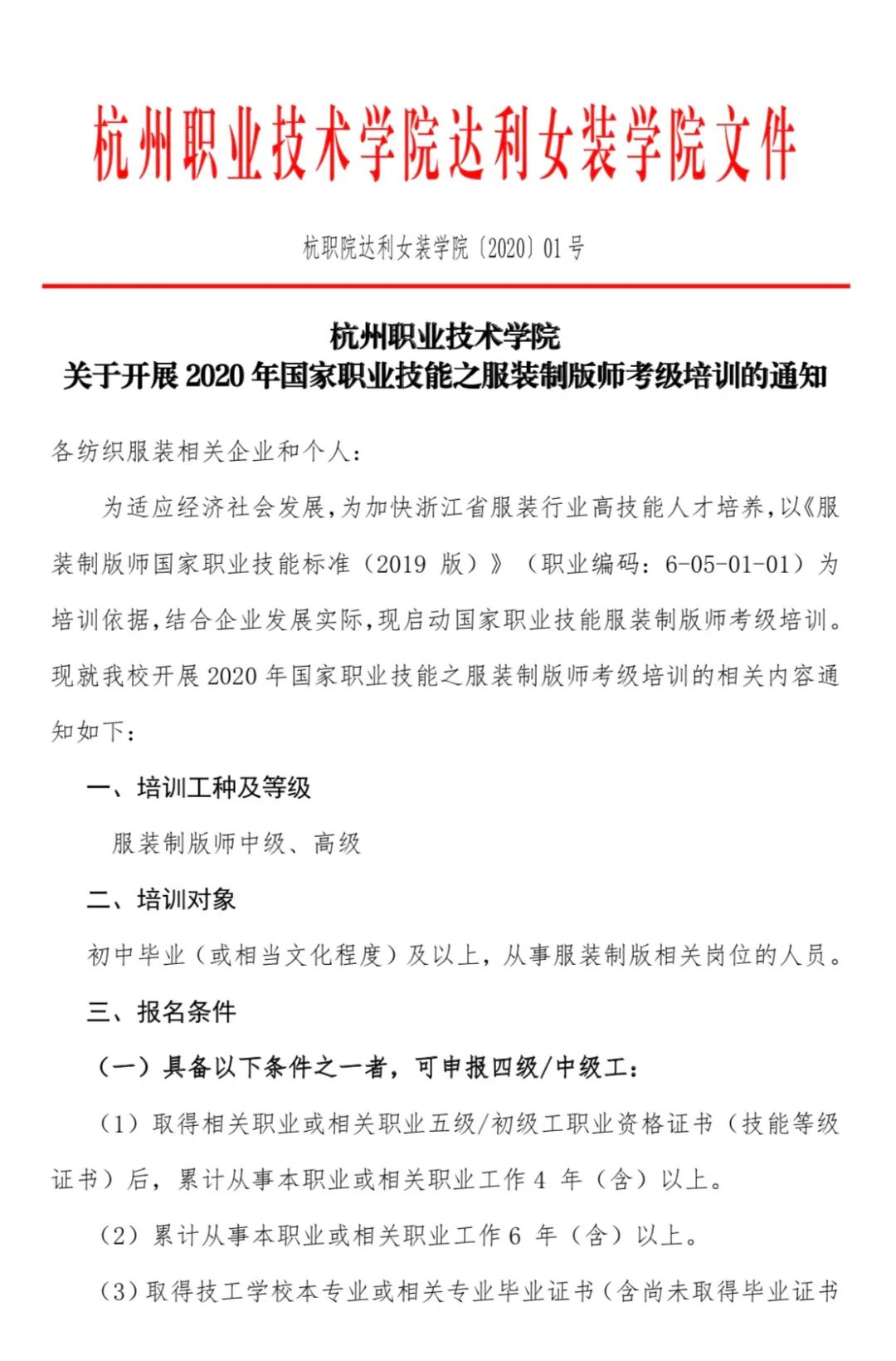 为了快速提升浙江省服装制版师队伍整体专业技能水平,保证职业技能鉴定质量,助力我省服装行业高技能人才培养建设,浙江省服装行业协会服装制版师职业技能鉴定所特别委托杭州职业技术学院启动国家职业技能服装制版师考级培训工作。本次培训等级为服装制版师中级、高级。具体通知如下: