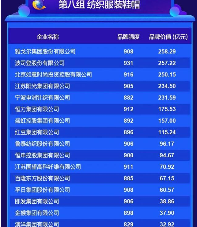 今年在参评条件要求较高的前提下,申报评价的品牌数量达到了830个,包括大部分行业的龙头企业。本次发布品牌数量达564个,总品牌价值为73563亿元,品牌价值均值比去年增长了5.1%。本协会副会长单位雅戈尔以258.29亿元品牌价值在纺织服装领域排名第一,安正时尚集团股份有限公司和宁波申洲针织有限公司也荣登该榜。