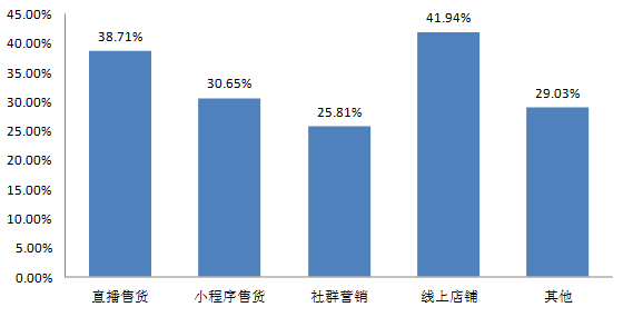 虽然国内疫情防控形势转好,但内需市场并未出现反弹式增长。企业只能根据自身条件采取降价促销、缩减产能、开拓内销市场,个别的甚至停产、裁员等措施应对此次危机。但是,危机往往与机遇共存。疫情的突发打破了人们以往的生活习惯、消费理念以及消费习惯。由此产生了全新的、革命性的变化,必将衍生出新的消费趋势。在一定程度上,此次疫情倒逼很多服装企业加快了线上渠道的布局,构建全渠道营销体系,进一步深化线上线下融合。面对实体零售的停摆,不少会员企业纷纷通过加强电商运营、开设直播、小程序、微商等方式将业务重心转移到线上,通过新零售模式进行数字化转型,在短期内弥补疫情对于线下业务的影响。从调研反馈来看,疫情期间,19.34%的会员企业从纯线下销售模式转为线上销售,54.84%的会员企业采取多种形式加大了对线上销售渠道的布局。其中,直播销售模式占比38.71%、小程序售货占比30.65%、社群营销占比25.81%、线上店铺占比41.94%,其他模式占比29.03%。