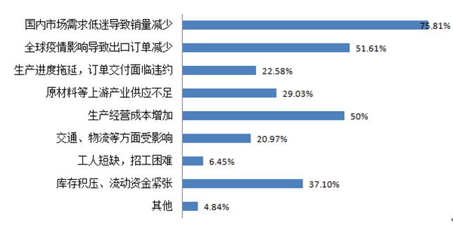 随着国内疫情防控形势好转,复工前期最为突出的工人返岗难及物流不畅问题已逐步缓解。国内市场需求低迷、出口订单撤单成为目前企业生产经营中面临的首要困难。参与调研的企业中,75.81%的企业面临国内市场销量大幅缩减的问题;51.61%的企业因全球疫情蔓延导致国外订单面临撤单或延期交付(这其中,有57.55%的外贸企业面临部分撤单,延期交付;17.23%的企业面临全部撤单,接受赔偿)。此外,还有生产经营成本增加、库存积压(暖冬引起的冬装销售不畅、疫情导致的春夏装滞销)、流动资金紧张等多重问题使得企业负荷加剧。