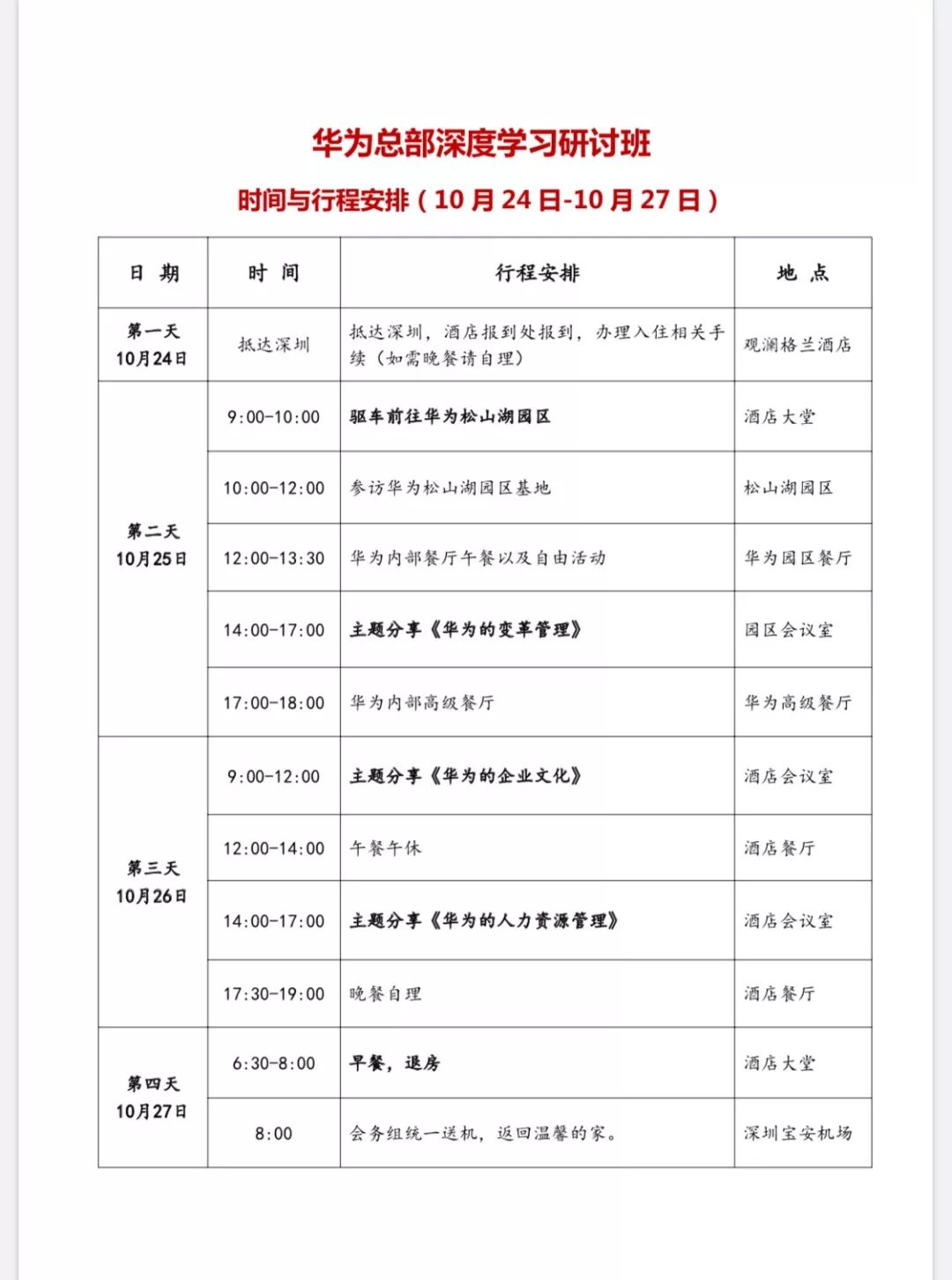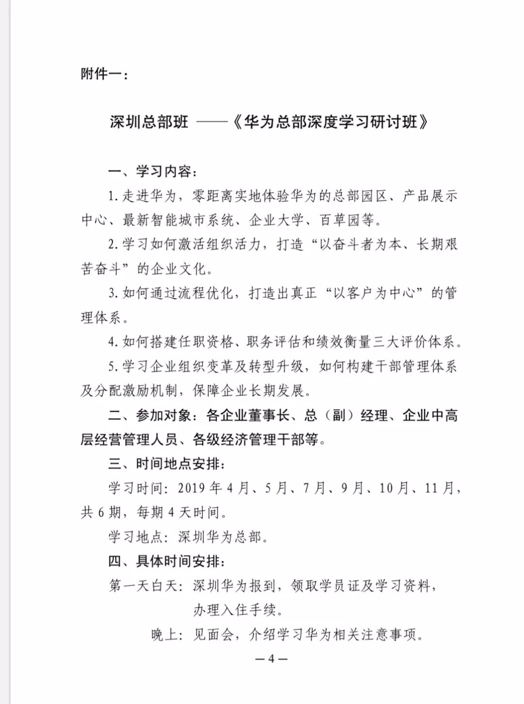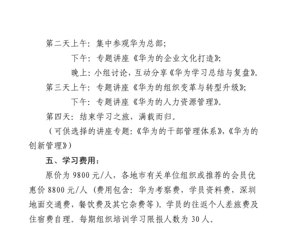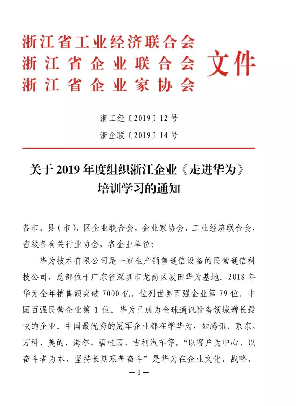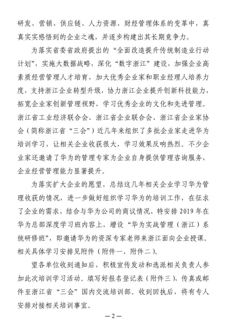 浙江省工业经济联合会、浙江省企业联合会、浙江省企业家协 会(简称浙江省“三会”)将于10 月24 日-10 月27 日组织浙江企业《走进华为》培训学习。现将具体通知转发给各会员单位,通知如下:
