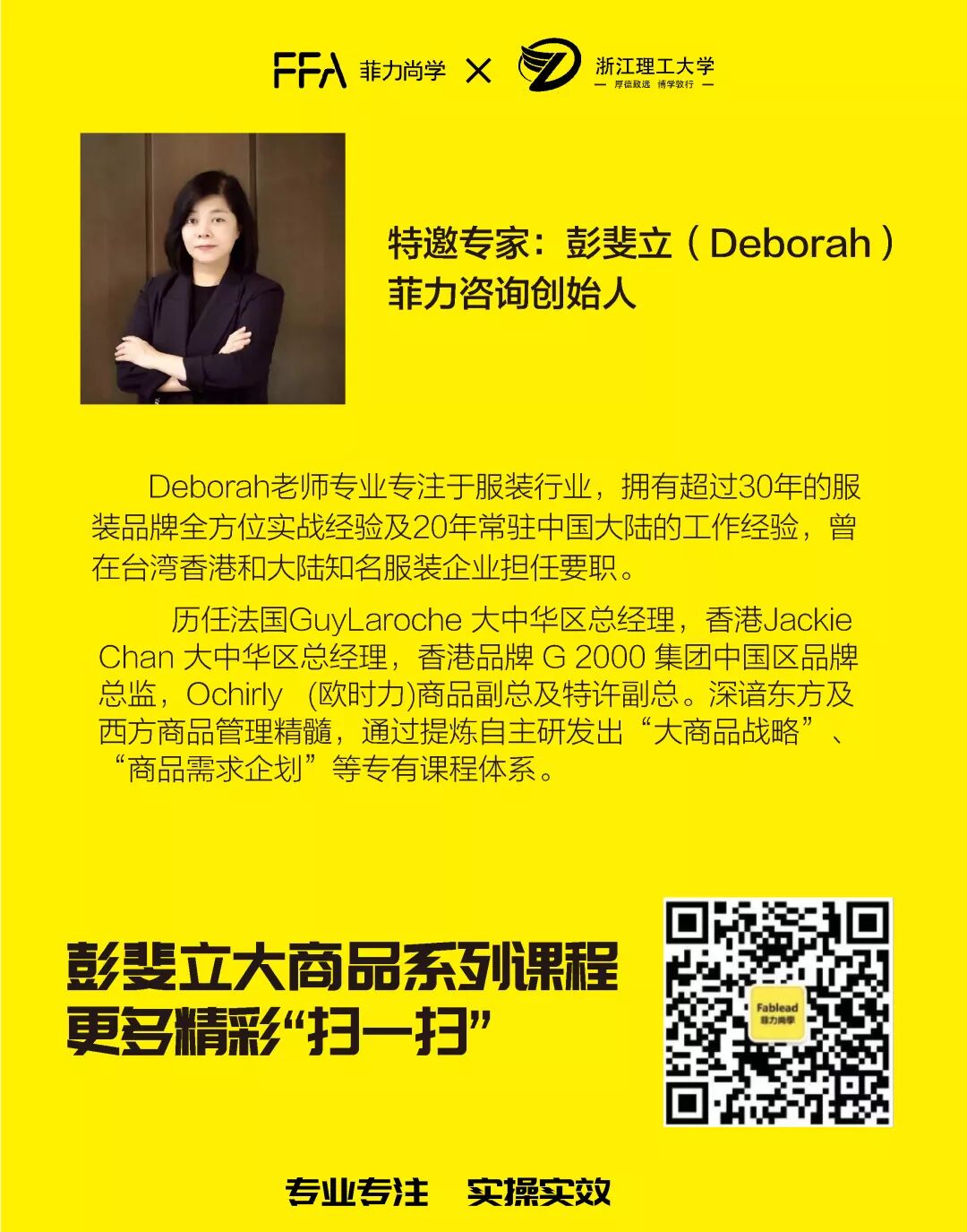 本次时尚品牌管理高研班很荣幸地邀请到菲力咨询创始人彭斐立老师,她拥有时尚零售从业30余年经验,深谙东方(日本体系)以及西方(美国体系)商品管理精髓,深深理解中国企业面临快速变化的市场环境时的无助,通过本次时尚品牌管理高研班,彭斐立希望能启发所有参与课程的企业审视自己的优势和战略重心。