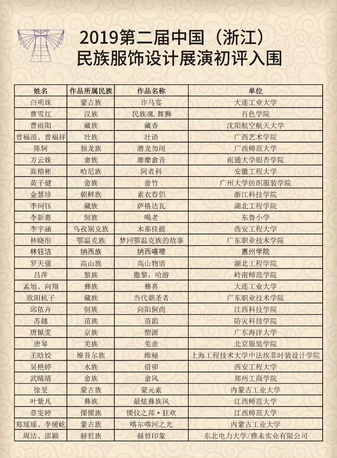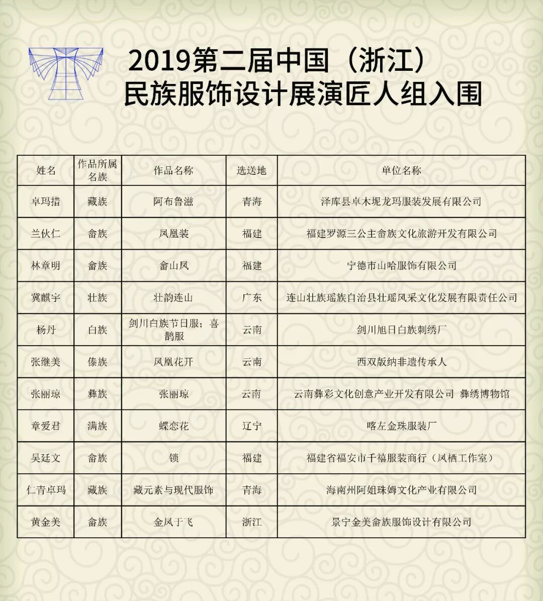 3月9日下午,第二届中国(浙江)民族服饰设计展演初评在桐庐莪山畲族乡举行,经过评审团评选,入围名单如下: