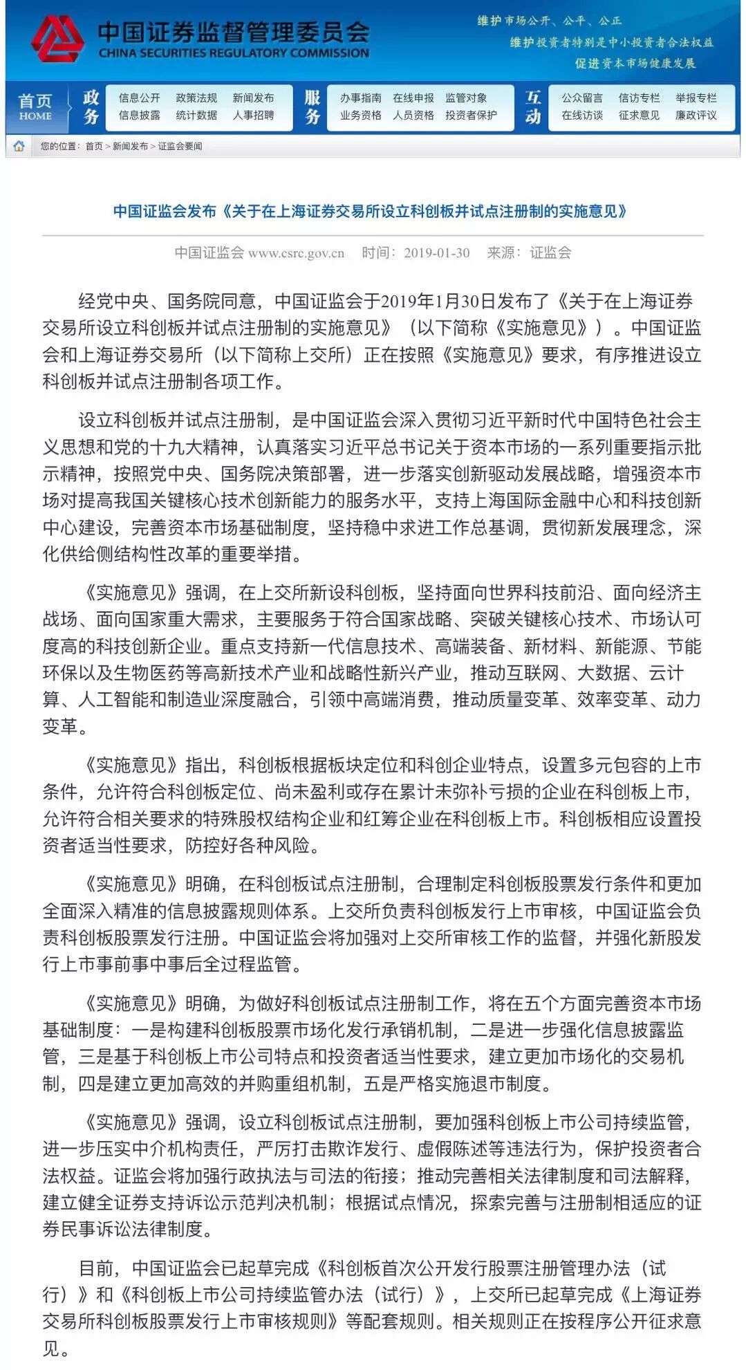 1月30日,中国政府法制信息网发布了《科创板上市公司持续监管办法(试行)》(简称《监管办法》),证监会发布了《关于在上海证券交易所设立科创板并试点注册制的实施意见》(简称《实施意见》),随后,上交所也发布了《关于在上海证券交易所设立科创板并试点注册制的实施意见》,明确了科创板改革的相关内容,自发布之日起实施。