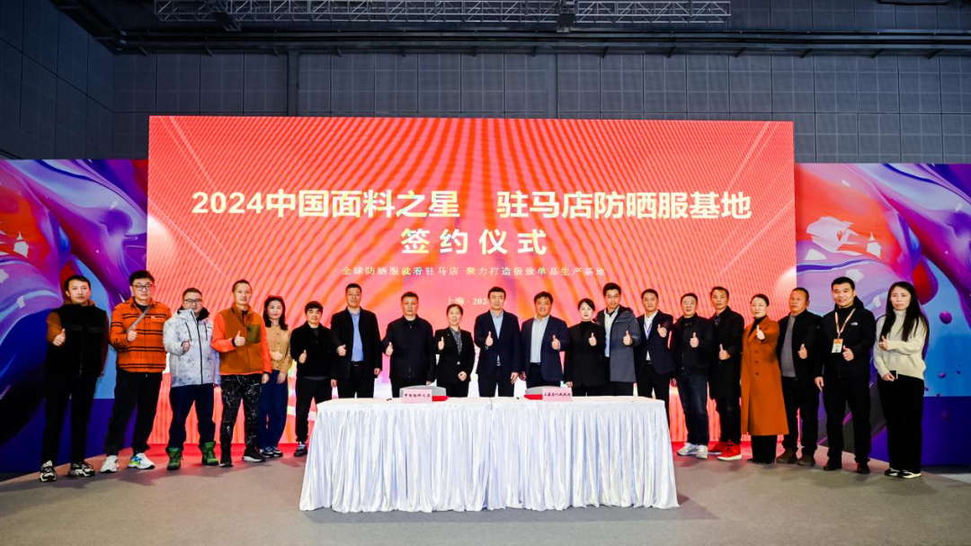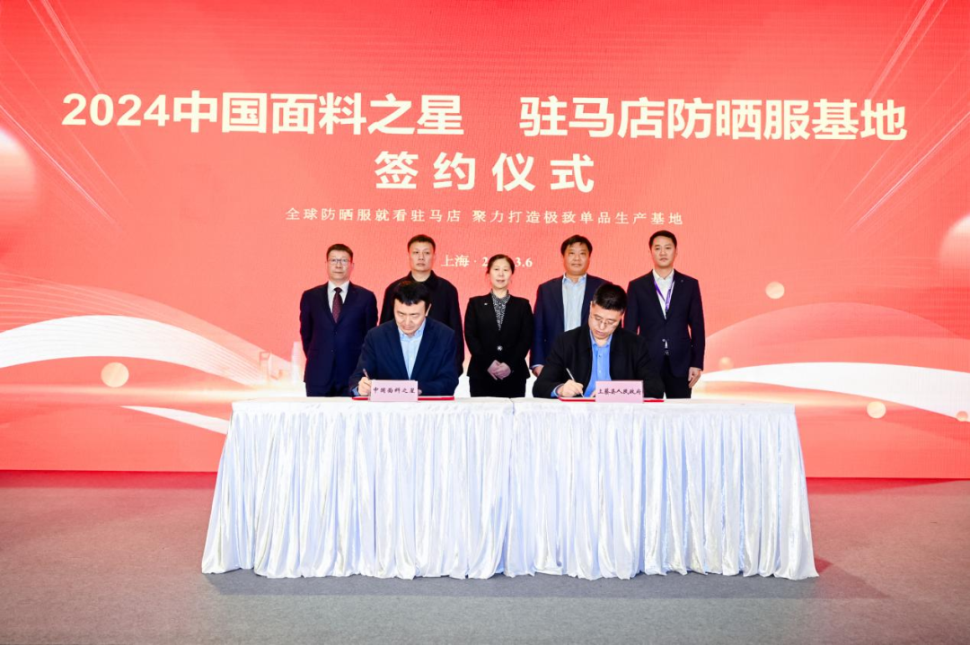 驻马店防晒服基地推介会上,中国纺织工业联合会新闻中心主任、《纺织服装周刊》杂志社社长徐峰代表“中国面料之星”活动与上蔡县副县长王忠新进行签约,2024中国面料之星与驻马店防晒服基地达成战略合作。杨晓东、常继红、宋庆林、李超、张勋等见证签约。