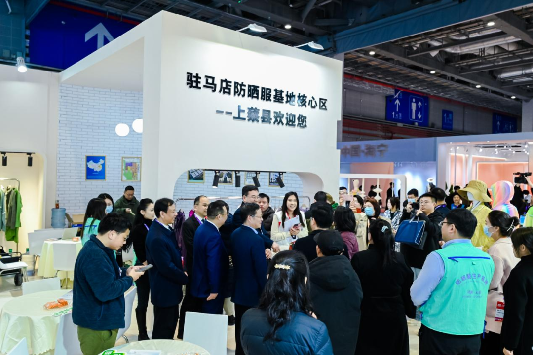 展会现场,中国纺织工业联合会会长孙瑞哲、中国服装协会顾问周一奇到展位指导工作。河南省工业和信息化厅副厅长常继红,驻马店市副市长宋庆林,上蔡县委书记李超,河南省服装行业协会常务副会长张勋,河南省现代轻纺产业联盟副秘书长刘书山等嘉宾到场见证,驻马店防晒服基地共建单位代表以及纺织服装周刊、中国纺织杂志社、大河财立方、河南卫视等媒体代表共同参加了驻马店防晒服基地展馆开幕仪式。