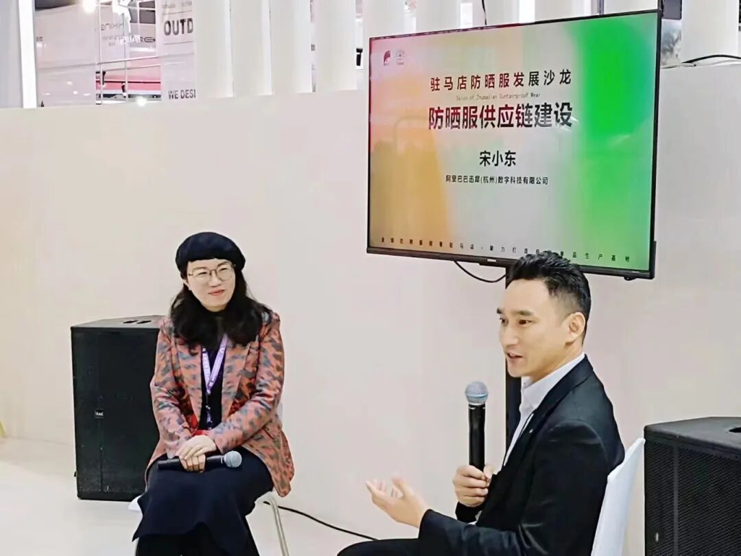 3月8日,阿里巴巴迅犀(杭州)数字科技有限公司犀牛智造制造运营负责人宋小东在展馆就“防晒服供应链”建设与河南省服装行业协会副会长郜虹展开对话。