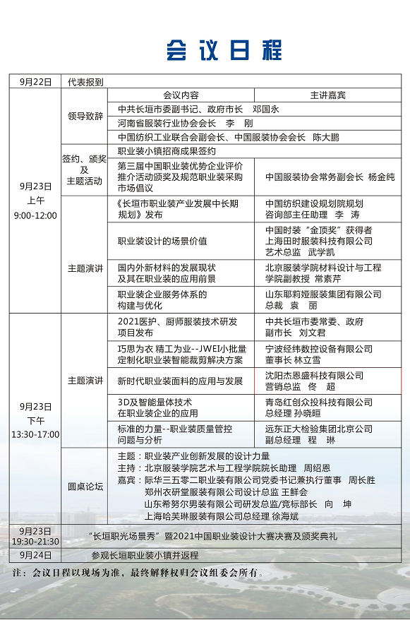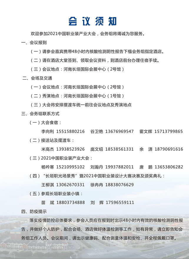 2021年中国职业装产业大会系列活动由中国服装协会、长垣市人民政府联合主办,中国服装协会职业装产业委员会、河南省服装行业协会承办。活动有利于优秀职业装企业及关联产业资源向长垣·职业装小镇汇聚,进而对推进长垣·职业装小镇的建设发挥积极作用。本次大会将充分发挥中国职业装产业大会系列活动的平台作用及引领作用,2021中国职业装产业大会系列活动将由“一会”、“一赛”、“一秀”、“一展”“一节”板块构成。