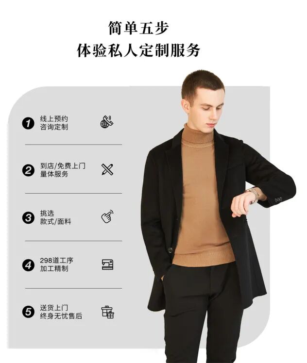 自2016年起,公司就将“百士风”品牌定位为高端定制,“百士风”也一直在全力发展个性化全品类定制业务:私人高定面对对服装风格、品质有独特见解和要求的高端人群,主要产品包含商务西装、羊绒大衣、宴会礼服等。