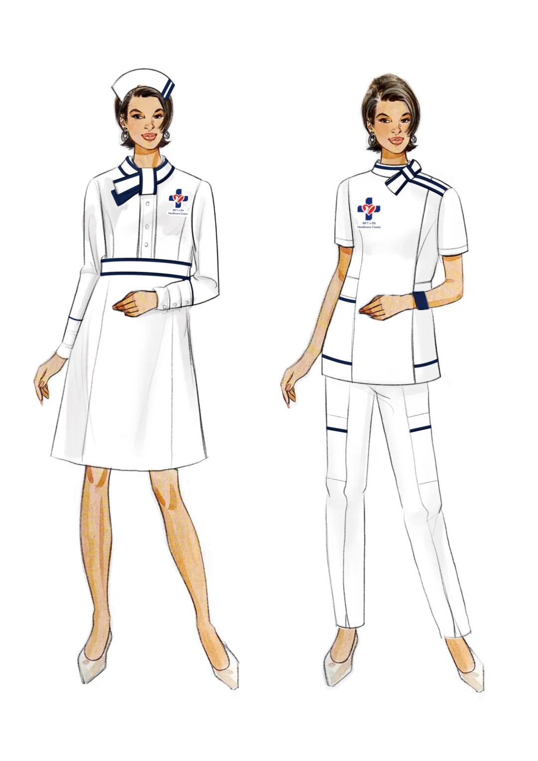 款式设计上以简洁、大方、便于活动为宗旨,同时融入立领、小翻领、局部镶边等设计,使医护服装在整体端庄严肃的氛围下又不失活泼轻松的感觉,体现出既神圣高洁又温柔可亲的医护工作者形象。