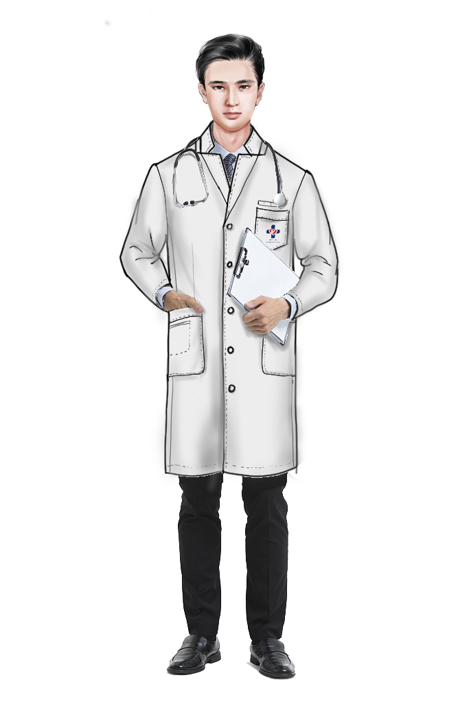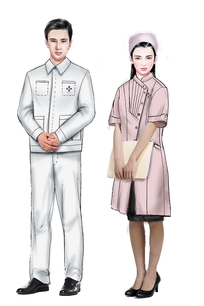 款式上服装整体以实用性为基准出发点,再加之凸显美学的细节。男女医生服装加入中式立领元素,区别于传统领型,体现中国特色。护士服装款式采用非对称结构,能够在较严肃的环境中增加活跃气氛;病号服装,以人为本,充分考虑到各类病人的不同需求以及穿脱的便捷性,合理进行结构设计,解决痛点。