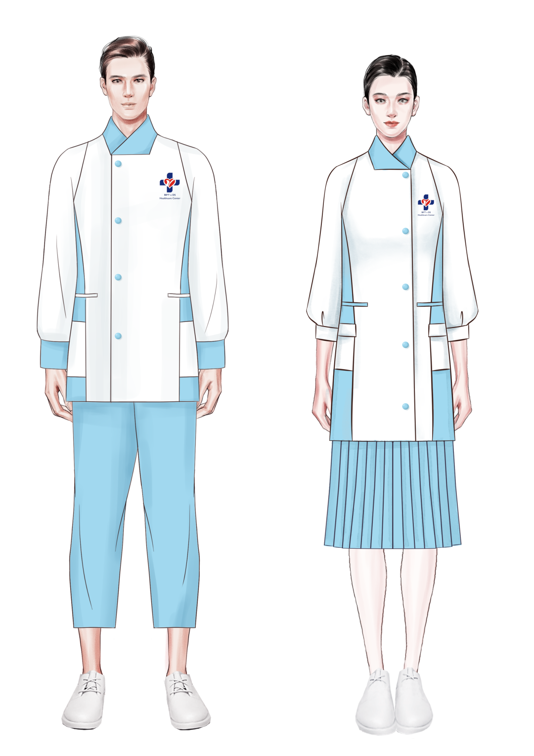 颜色以白色为主,蓝色和灰色局部点缀的方式,既体现了医护人员纯洁善良的高贵品质,又体现了他们稳重严谨的工作态度。面料使用功能性医护新材料,具有吸湿速干、抑制细菌、耐洗耐磨、抗静电等功效,提高医护人员穿着舒适度。