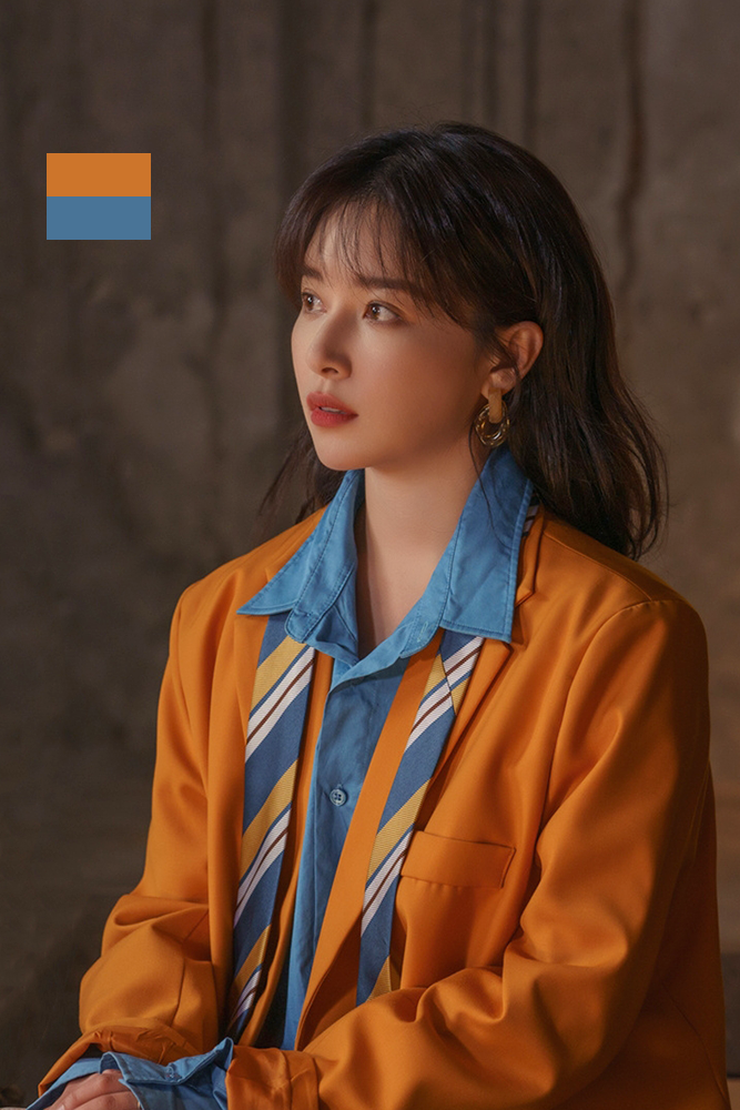 在日常复古风穿搭中,我们可以优先选择对比色,再适当降低颜色亮度,这样搭配出来的颜色既不会过分亮眼,又不失复古感。