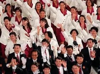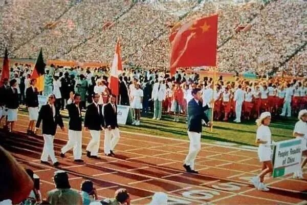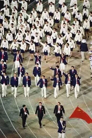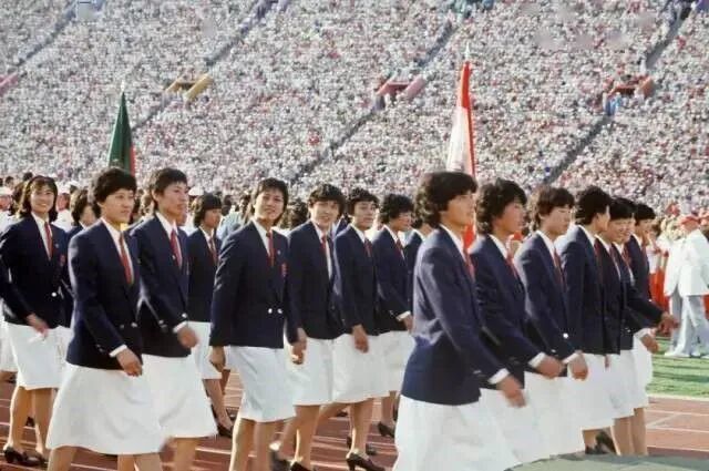 1984年,新中国代表团首次参加奥运会,代表团的服装特别的“洋气”。深蓝色西装上衣搭配白色裤子或者及膝裙子,借鉴了欧美的制服风格,并在领带处加入了一部分中国红的元素,整体简洁大方,又不失庄重。