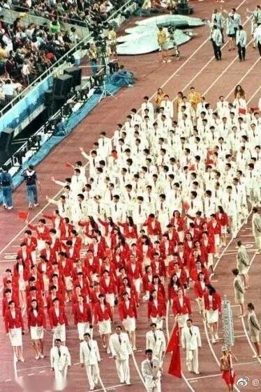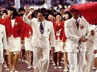 1988年汉城奥运会,中国代表团的奥运礼服是全白色,仅在内搭和领带加入了中国红的点缀元素。看起来清新自然,是很适合夏日的配色。