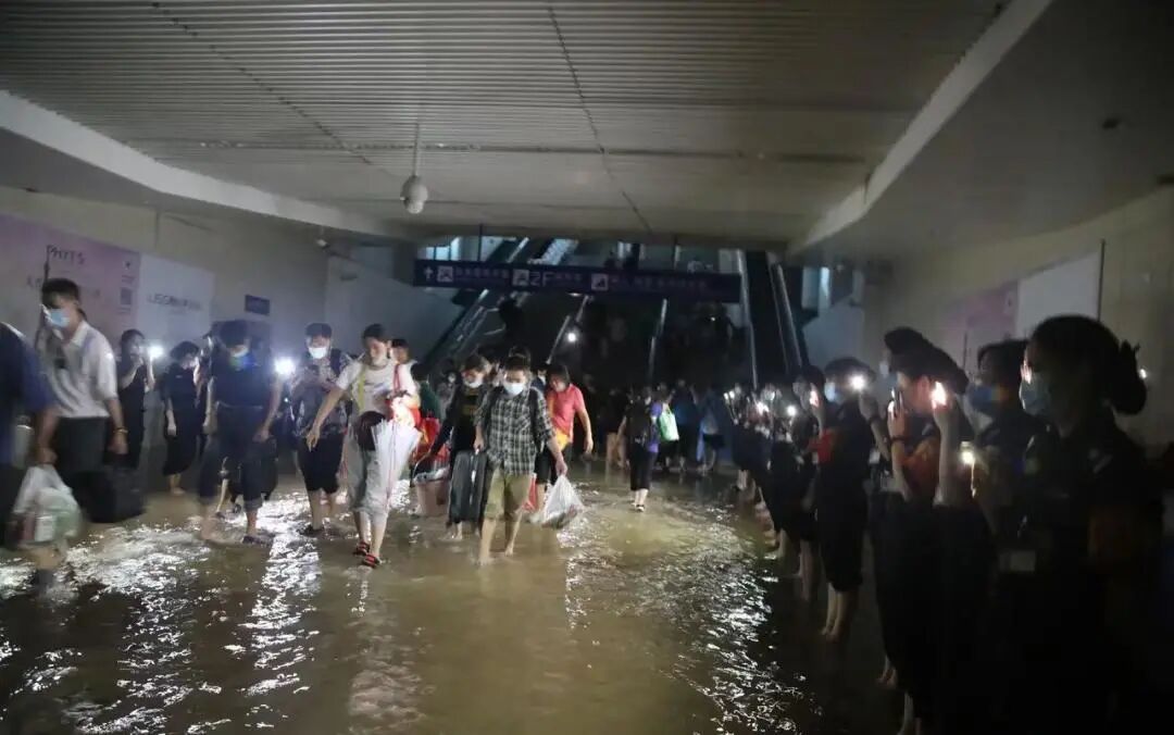 7月20日深夜的郑州火车站,工作人员用手机为乘客照亮疏散通道