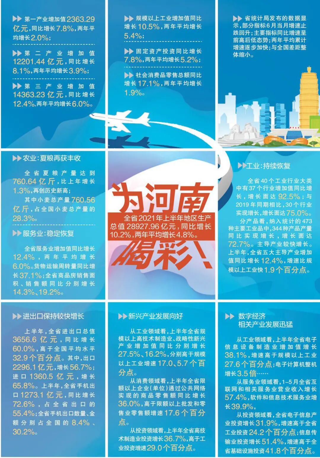 步入7月,2021年进入下半年,河南省上半年经济社会发展成绩如何?7月19日,省统计局发布数据显示,全省地区生产总值28927.96亿元,同比增长10.2%。值得一提的是,河南进出口总值3656.6亿元,同比增长60.0%,高于全国平均水平32.9个百分点。