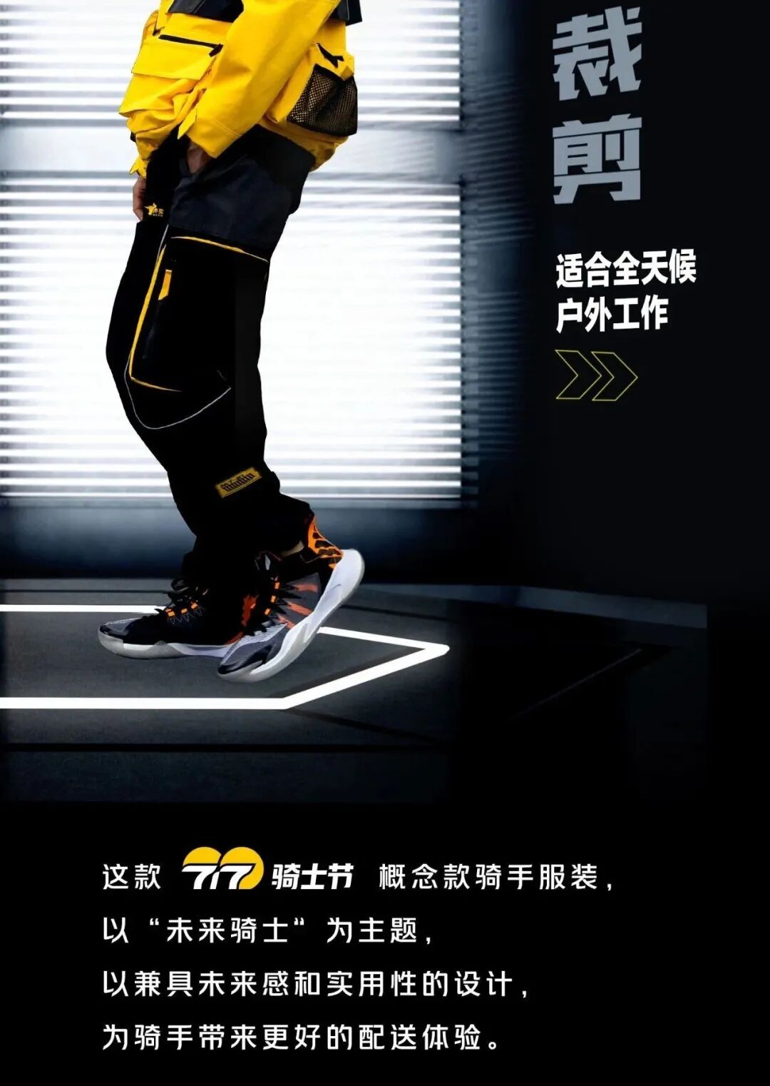美团破圈跨界李宁设计了一款717概念款骑手服装,这款服装以“未来骑士”为概念,采用机能剪裁和反光设计,适合全天候户外工作,更加保障了外卖骑手们夜间出行的安全。