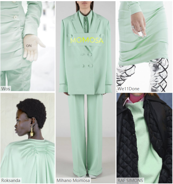 湖绿色是典型的跨季色彩,清澈明亮的色彩感受打破秋冬一贯的浓郁色调。湖绿色的市场应用范围非常广泛,无论是少淑女、成熟优雅、还是休闲微潮的风格都可以驾驭。重点在于材质的选择,会赋予湖绿更多面的的表现。与金属色或黑白中性色做搭配会更受年轻市场欢迎。