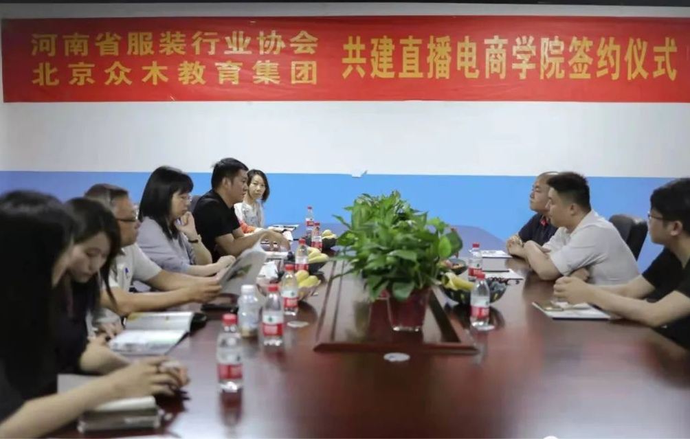 2021年6月3日,河南省服装行业协会常务副会长张勋,专职副会长高亚爽,副秘书长李文杰等人一行到北京众木国际教育河南事业部进行参观,北京众木国际教育河南事业部总经理张凯,商务部总监赵赫,教务部主任刘志鹏等热情接待了考察团一行。参观之后,双方就“共建直播电商学院”举行签约仪式。