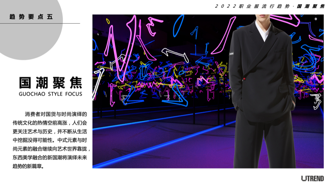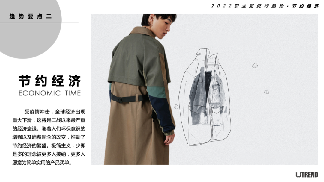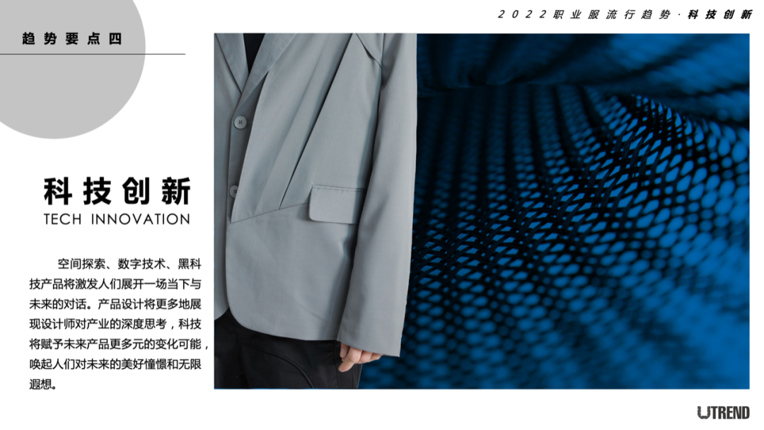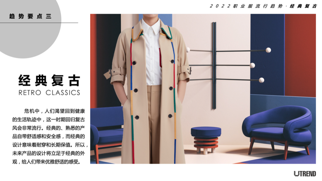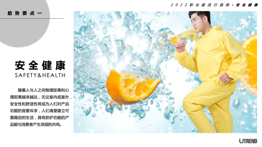 在2021 OUE上海职业装·团服展览会上,东华大学服装学院职业服研究所发布了2022年职业服流行趋势,此次流行趋势共分为六大主题:“安全健康”、“节约经济”、“经典复古”、“科技创新”、“国潮聚焦”、“可持续时尚”。通过对行业文化背景的分析和职业服流行趋势的宣讲和解读,旨在引导职业服行业和设计朝着安全、实用、多功能以及可持续的方向发展。