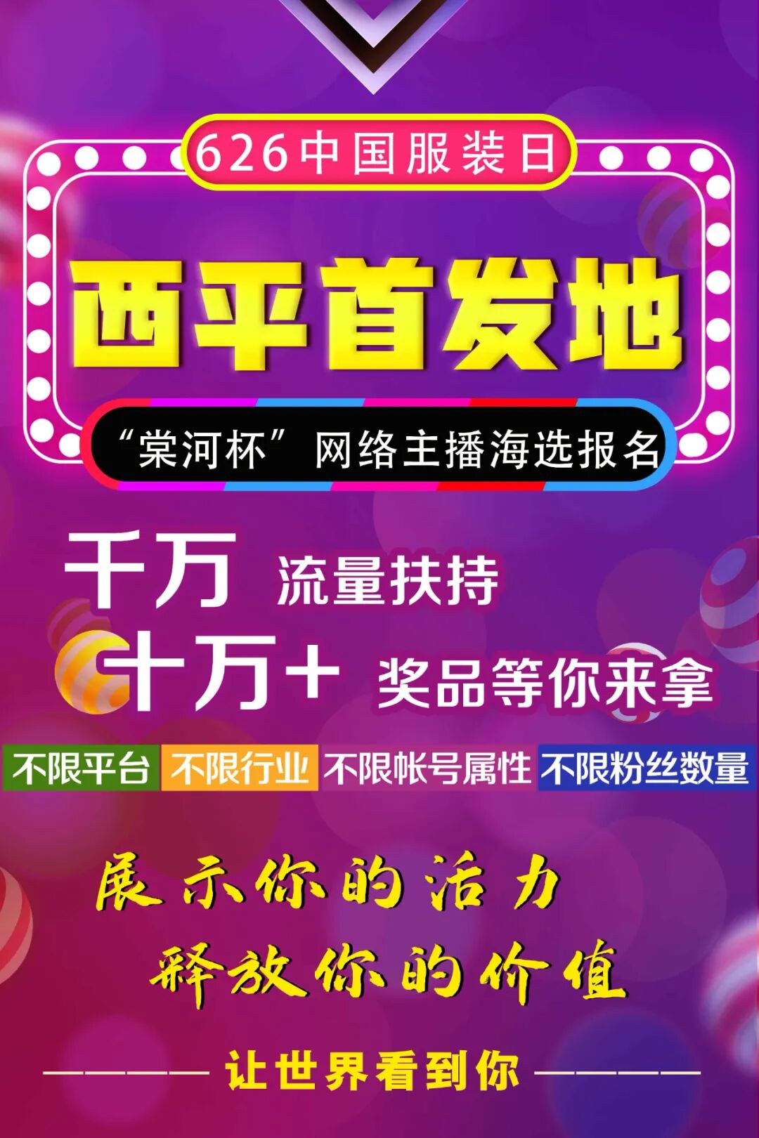 为集中展示西平县经济发展成就,提高西平知名度、影响力,助力企业开拓销售渠道,打造西平本土品牌,特举办6.26中国服装直播日西平首发地网络主播海选大赛。
