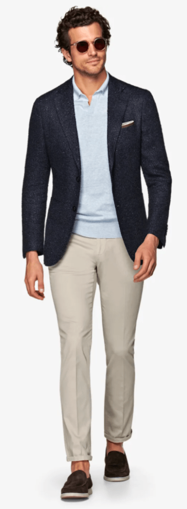 穿搭要素:轻薄单西;纯色的polo衫;休闲裤;乐福鞋
