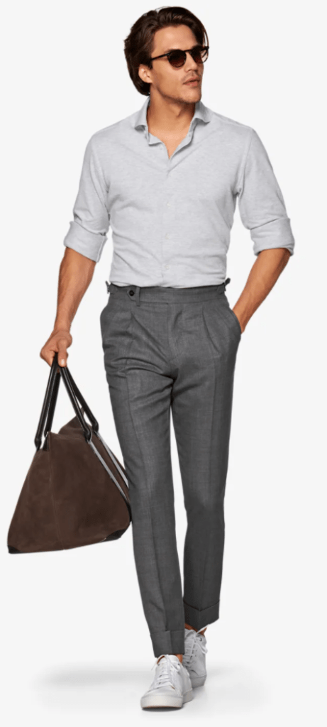 穿搭要素:短袖polo&衬衫;轻薄休闲裤;休闲鞋