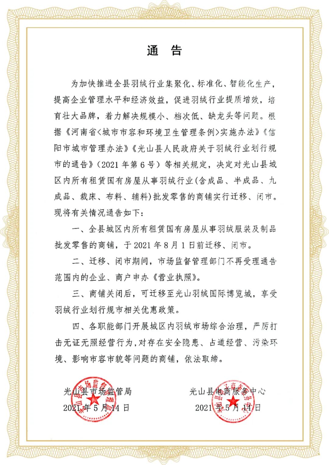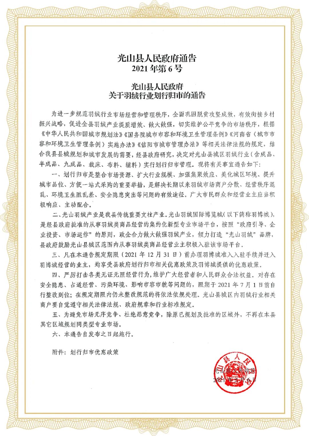 自光山县人民政府于2021年5月6日发布《关于羽绒行业划行归市的通告》以来,各职能部门积极开展专项整治,依法监管。通过政府引导、企业为主、市场运作的模式,鼓励城区范围内从事羽绒类商品经营业主积极入驻羽博城。