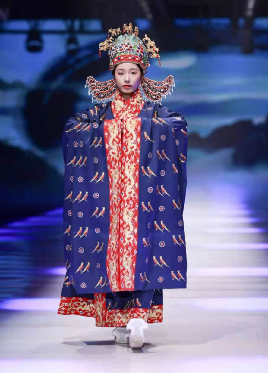 专业的刺绣、大摆的褶裙、精美的六龙三凤,十二龙六凤等雍容华贵的配饰,让我们清晰地看到了传统服饰与现代时装的融合,以及经典礼仪服饰标准与创新改良的对比呈现……设计师将中国传统文化融入服装设计中,把古风古韵演绎地淋漓尽致。