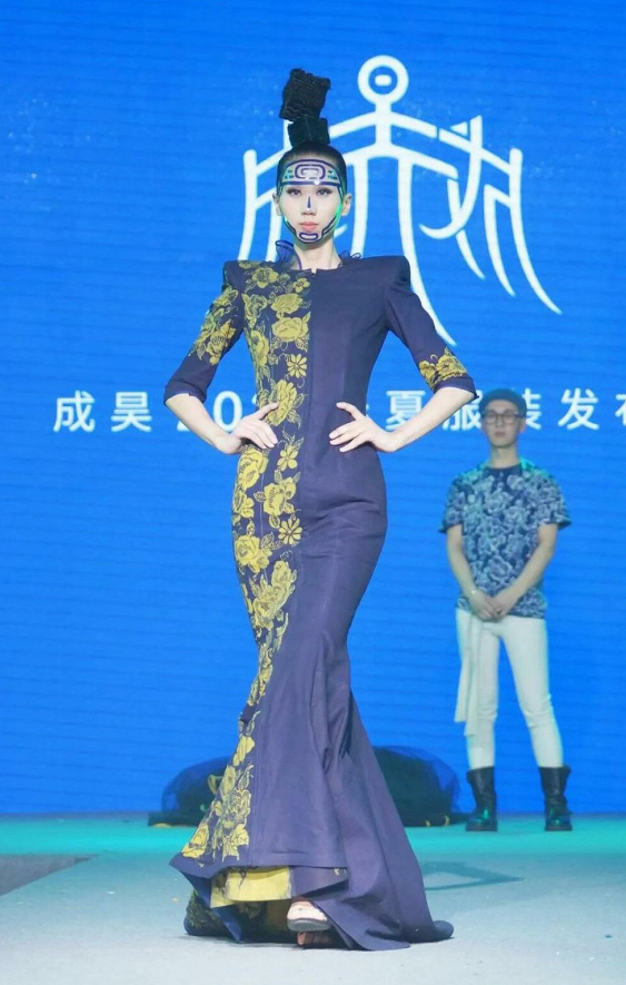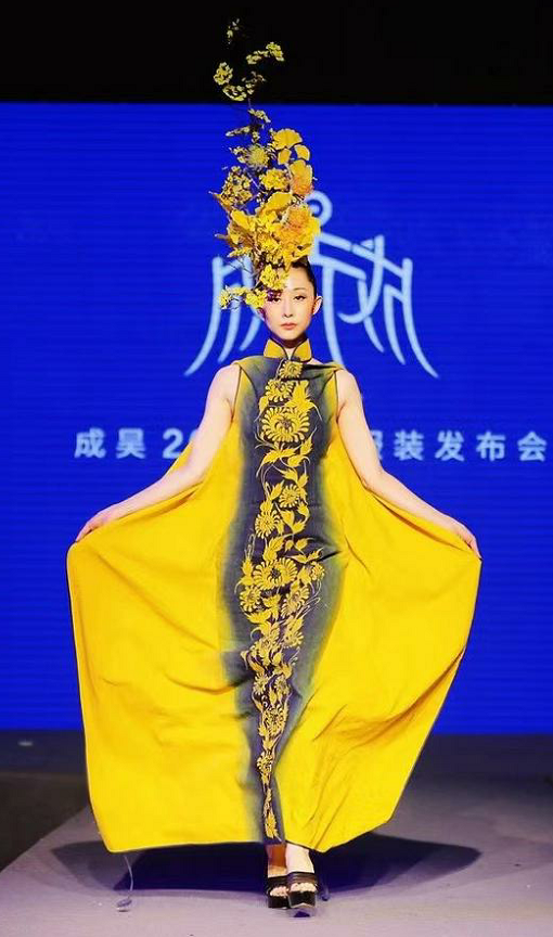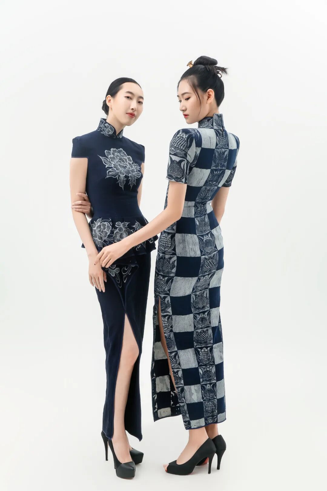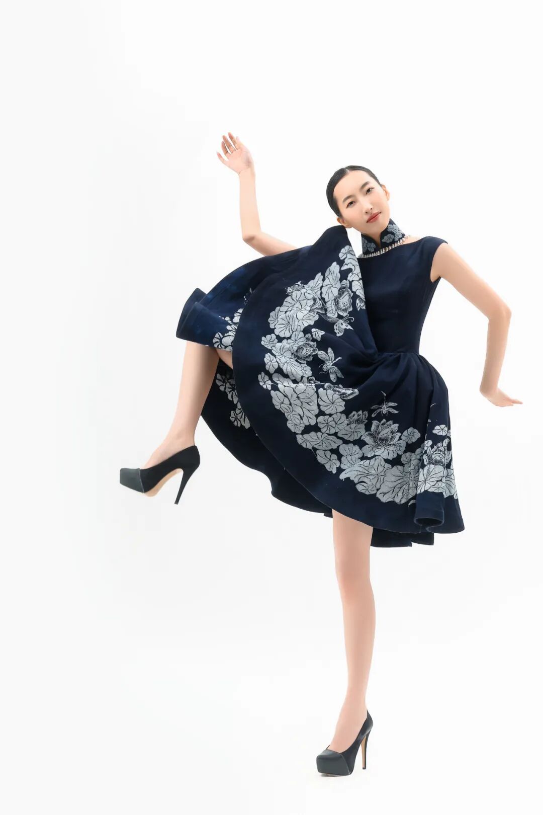 设计师运用十二花神的纹样做成衣服,倡导大家即使在再恶劣的环境下也依然要像花朵一样绽放。作品以非遗蜡染技艺为核心,打破传统的蓝底白花的视觉效果,加入了红、黄、绿、粉等色彩与草木染的碰撞,分别呈现五彩缤纷的十二月令花。