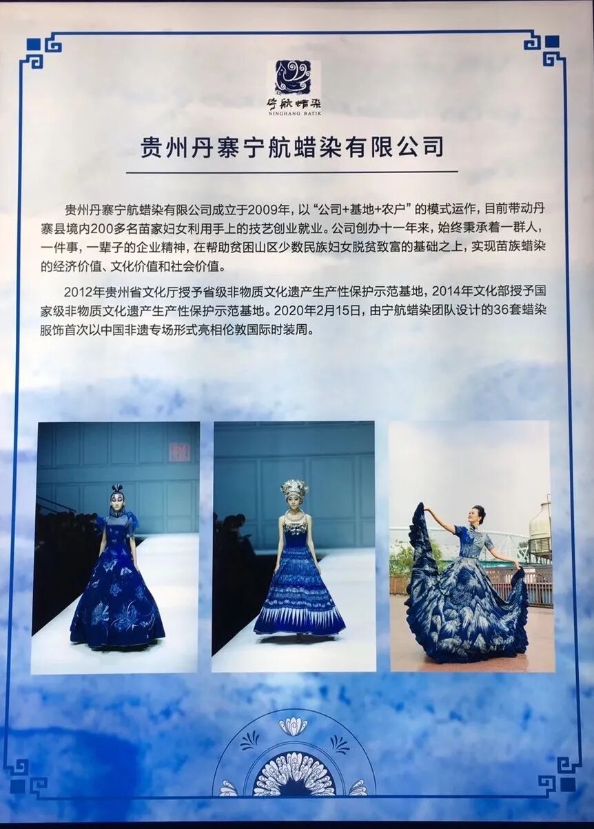 贵州丹寨宁航蜡染有限公司成立于2009年,以“公司+基地+农户”的模式运作,目前带动丹 寨县境内200多名苗家妇女利用手上的技艺创业就业。公司创办十二年来,始终秉承着一群人,一件事,一辈子的企业精神,在帮助贫困山区少数民族妇女脱贫致富的基础之上,实现苗族蜡染的经济价值、文化价值和社会价值。2014年文化部授予国家级非物质文化遗产生产性保护示范基地。2020年2月15日,由宁航蜡染团队设计的36套蜡染服饰首次以中国非遗专场形式亮相伦敦国际时装周。