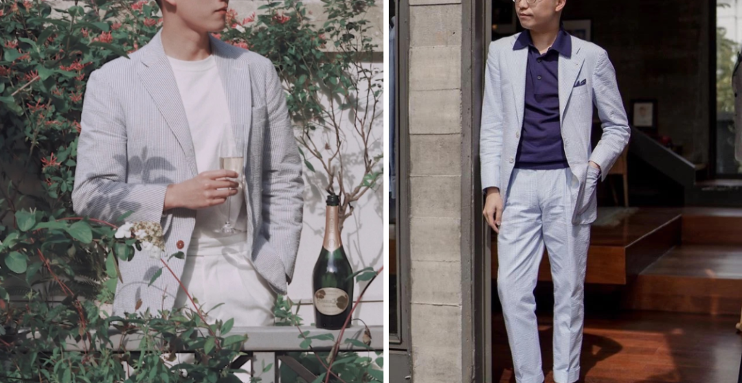 麻,棉和泡泡纱是制作轻便西服时最常用的天然面料,具有良好的透气性和较高的舒适性。选择夏天的通勤西装,讲究的是透气性和轻薄度。
