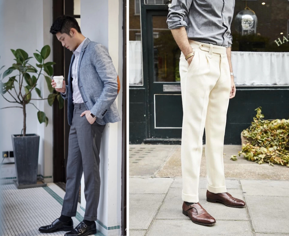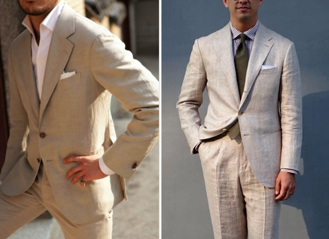 一般来说,穿亚麻面料的西装,裤子也最好搭配亚麻面料的,可以是套装(同色同料),也可以同料不同色搭配。