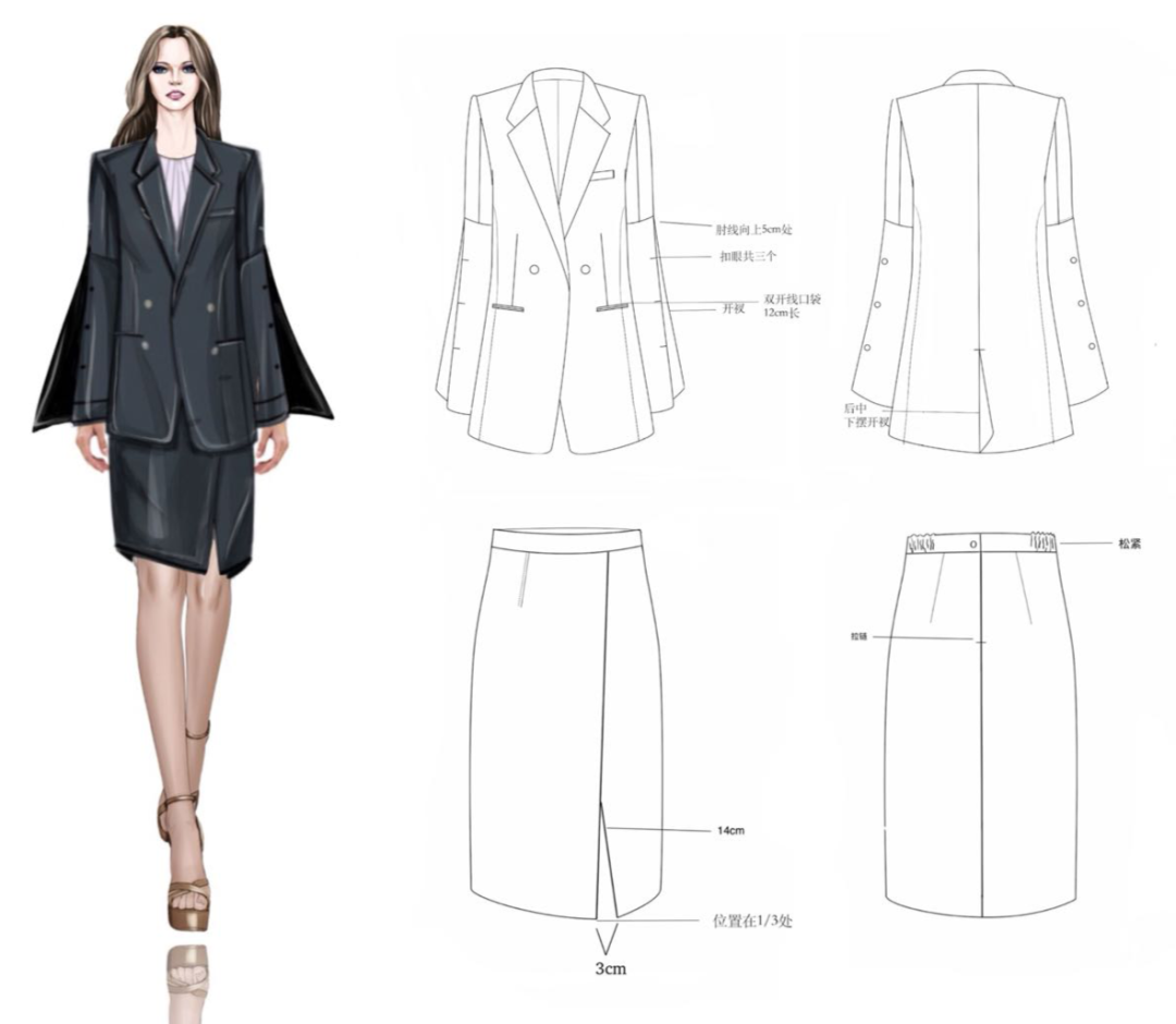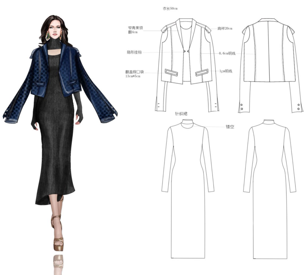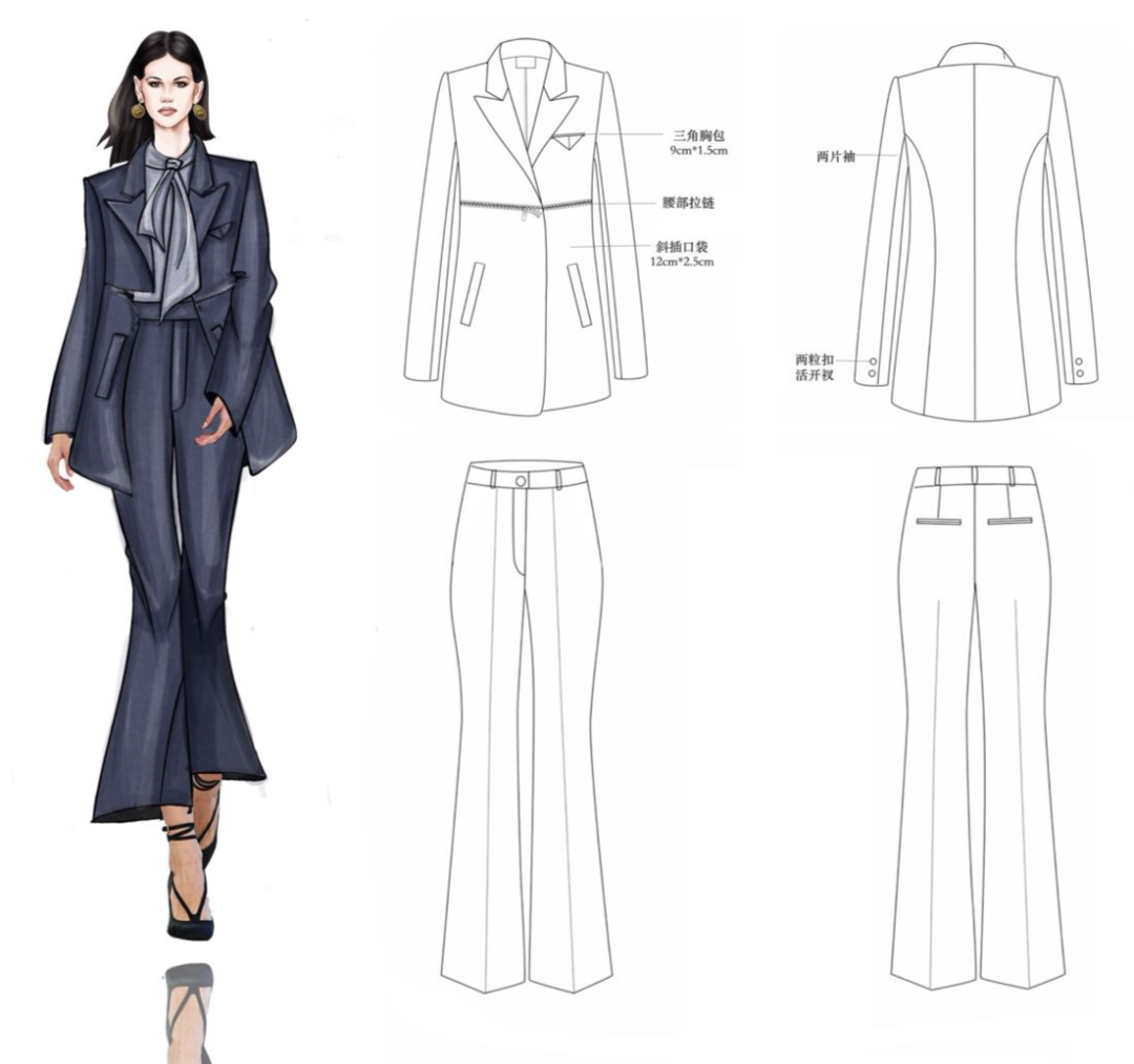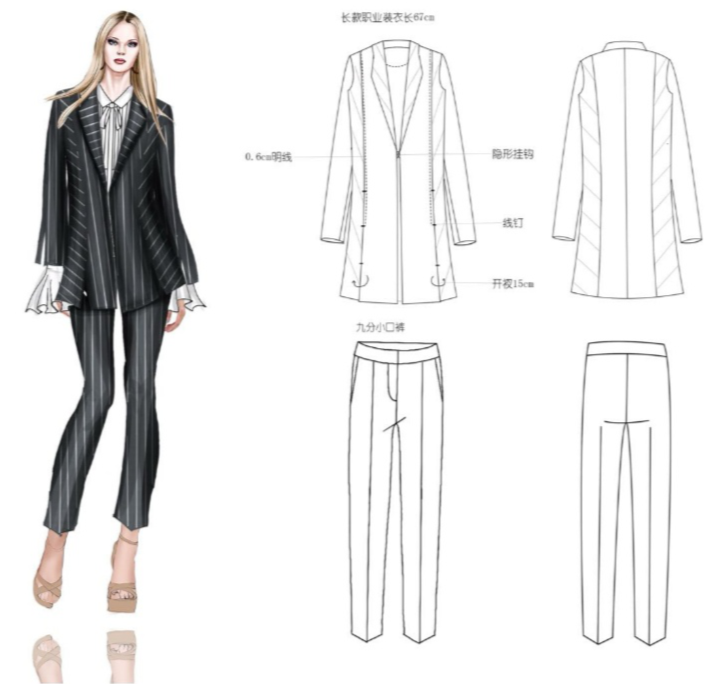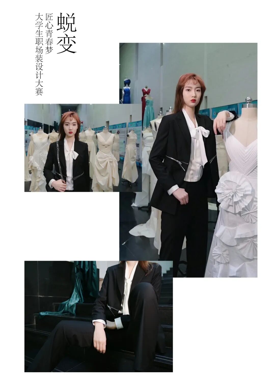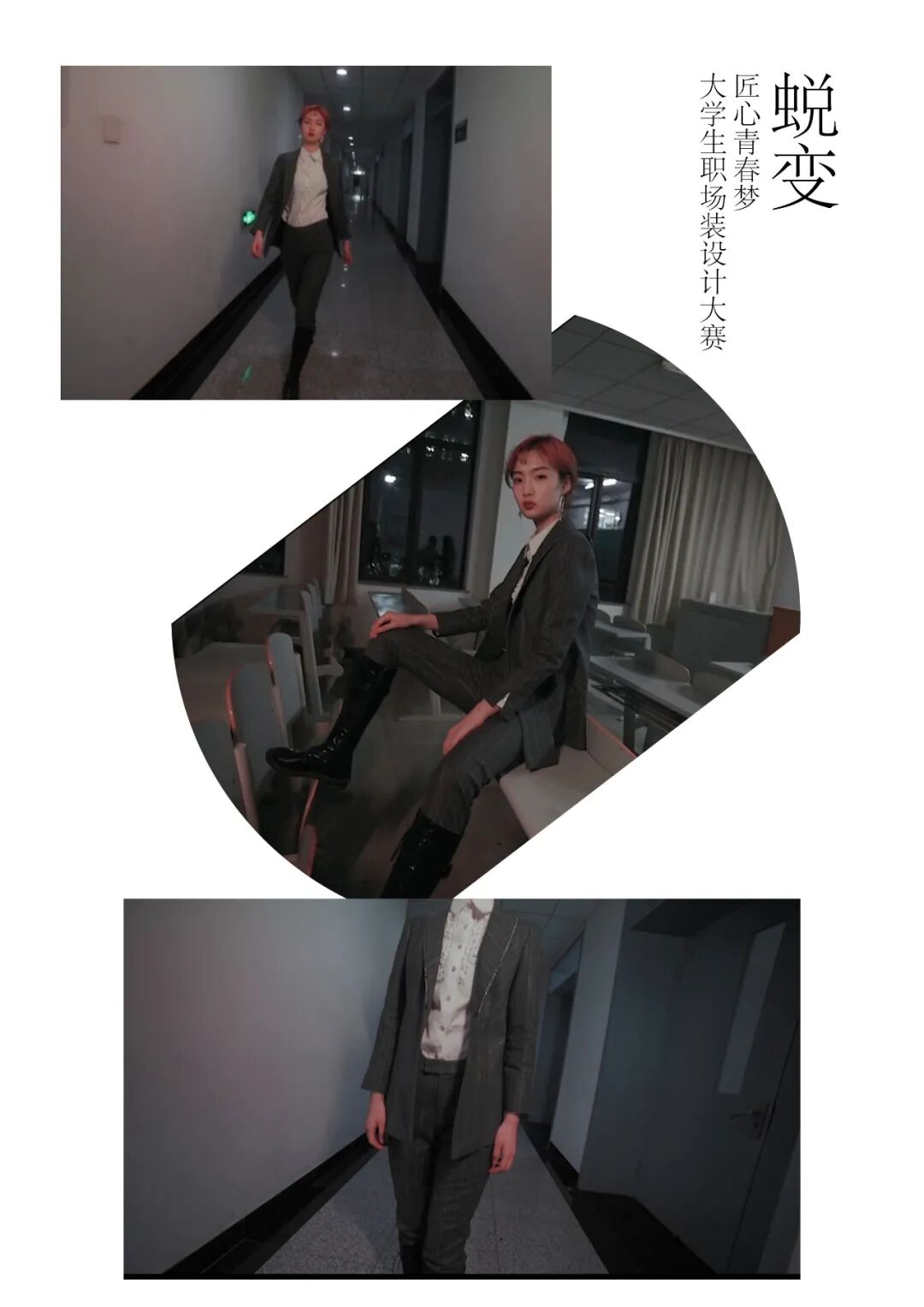 “蜕变”系列以时尚性和实用性为主,立体的结构形态搭配别致、醒目的装饰细节;轻薄硬挺的西服面料,搭配亮色的拉链、纽扣;运用简约的灰色、沉稳的黑色、深邃的蓝色,营造干练、稳重、知性、优雅的视觉效果;整体风格强调沉稳大气的同时亦能凸显青春活力,强调严谨干练的同时亦能展现知性优雅。