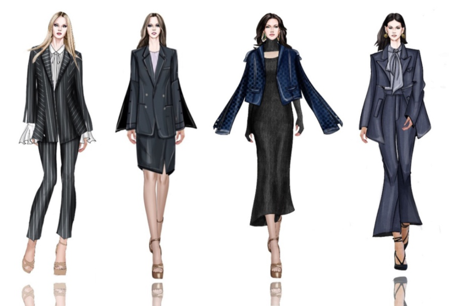 “蜕变”意味着化茧成蝶,在道家哲学里,意指一种状态向另一种状态的转变。当大学生们穿上“蜕变”,青涩与稚嫩全部消失殆尽,实现人生关键节点的华丽转身。本系列包含四套设计,整体廓形以H型为主,打破传统职业装,将简约沉稳的颜色与轻薄硬挺面料相融合,局部点缀亮色拉链和纽扣,在体现严谨沉稳的同时又不乏设计感。