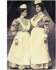 二十世纪10年代(1910年),围裙式的护士服穿起来像极了女仆,某些护士帽的设计使得其 “女仆装” 的特点更加明显。幸好,臂章显示了她们的职业,还能体现等级——初级护士的臂章是浅色的,而高级护士则为黑色。