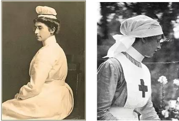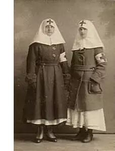 第一次世界大战期间(1914年),芬兰部队的随军护士(Red Guard Nurses)依然戴着修女式的头饰,覆盖了整个头颈,垂至肩膀。额头和臂章上都有红十字标志,很容易识别。由于极端天气,白色的护士服外还罩有一件厚厚的大衣。