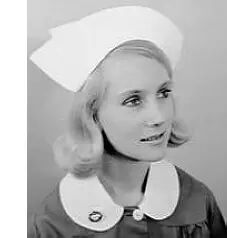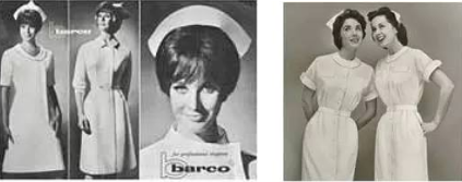 20世纪60-70年代(1960年),护士服的领口 “打开了”,其中以 “彼得潘式”( Peter-pan Styled)的小翻领最为盛行。这个时期护士服腰带的纽扣被移到前面,整体裁剪更加合身,还出现了一次性的护士帽。