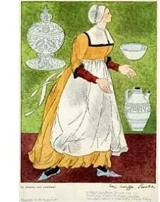 十九世纪50年代左右(1850年),下面图中这位护士穿了件有领子的格子衬衫,外加一条前面交叉的围裙。那时有很多护理小器械需要随身携带,可惜还没有实用的口袋设计,所以只能挂在腰间。