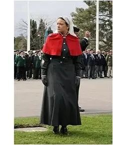这套格外帅气的护士服,是第一次世界大战期间(1914年)澳大利亚军队护士的制服。一件长袖的橄榄绿大衣,金光闪闪的纽扣从颈部一直到腹部。腰间束有皮带,以确保大衣贴身,外加一条红色的斗篷,身材高大的女性穿起来,要是没有头上那顶标志性的护士帽,还真难认出是位护士。