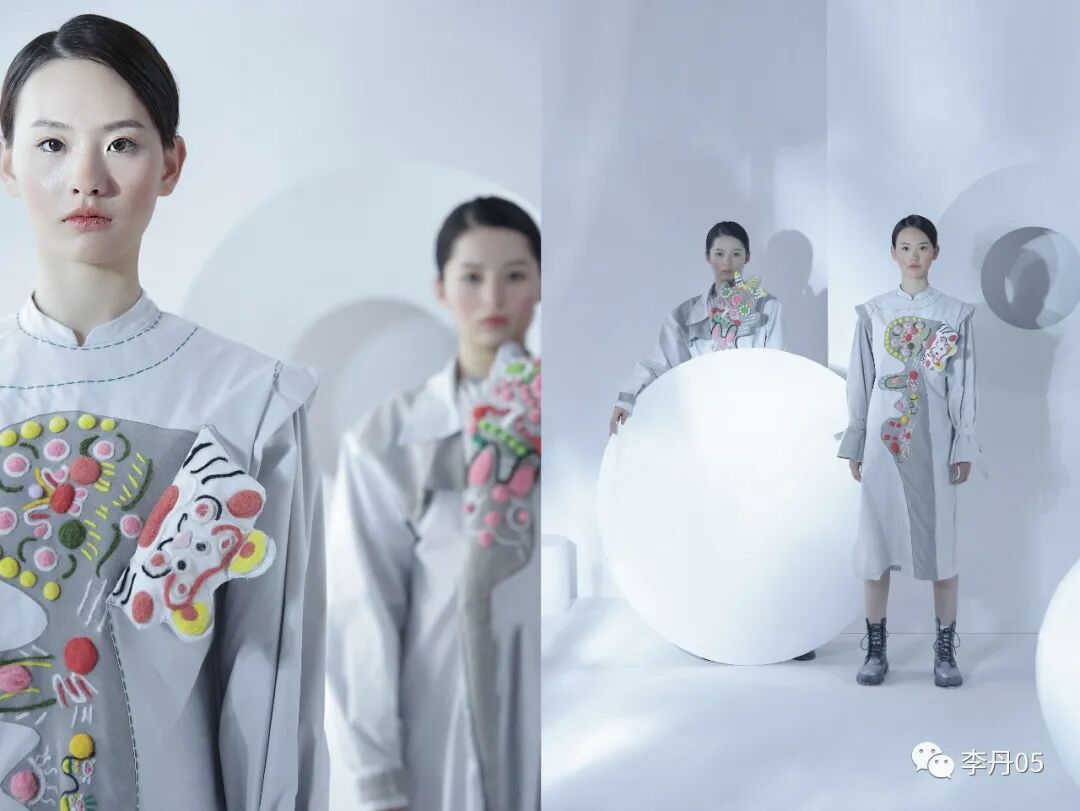 毕设作品简介:《延》系列的女装在元素提取及图案运用方面经过思考,选择了采用泥泥狗外观造型和身上的图案,充分表现了主题的意义。利用泥泥狗的图案在服装上进行羊毛毡、毛线戳、拼接等再造手来表现图案。