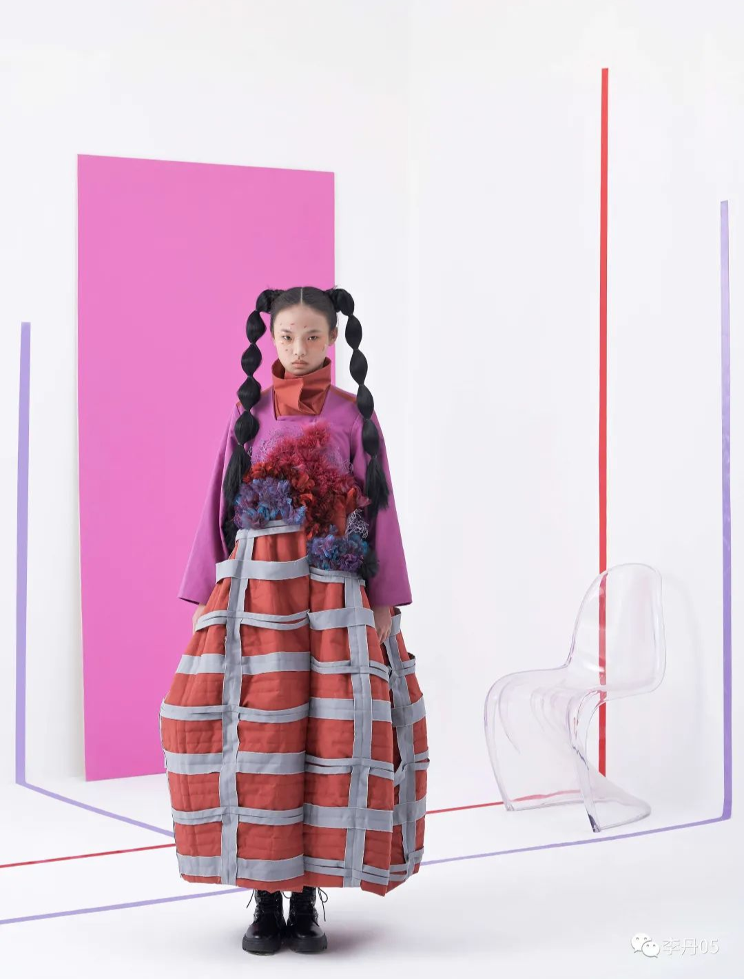 设计理念:本设计灵感来源于当代艺术家Essam Marouf和Adam Riches的艺术作品,主旨表达成年人面对人生中的各种沮境时顽强拼搏的勇气及信念。通过面料的艺术再造手法及色彩的运用搭配来表现这一设计理念。