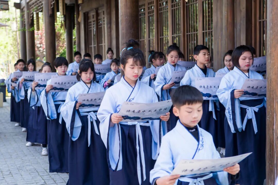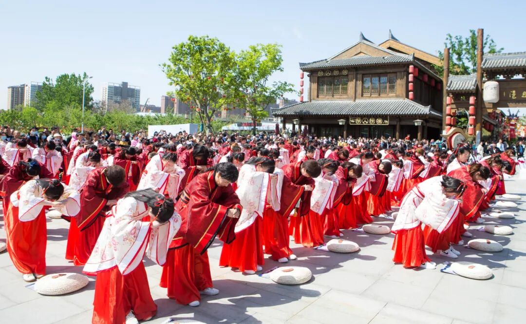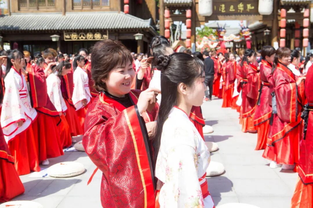 身着华服的66位少女,在父母宾朋的见证下完成少女笄礼仪式。
