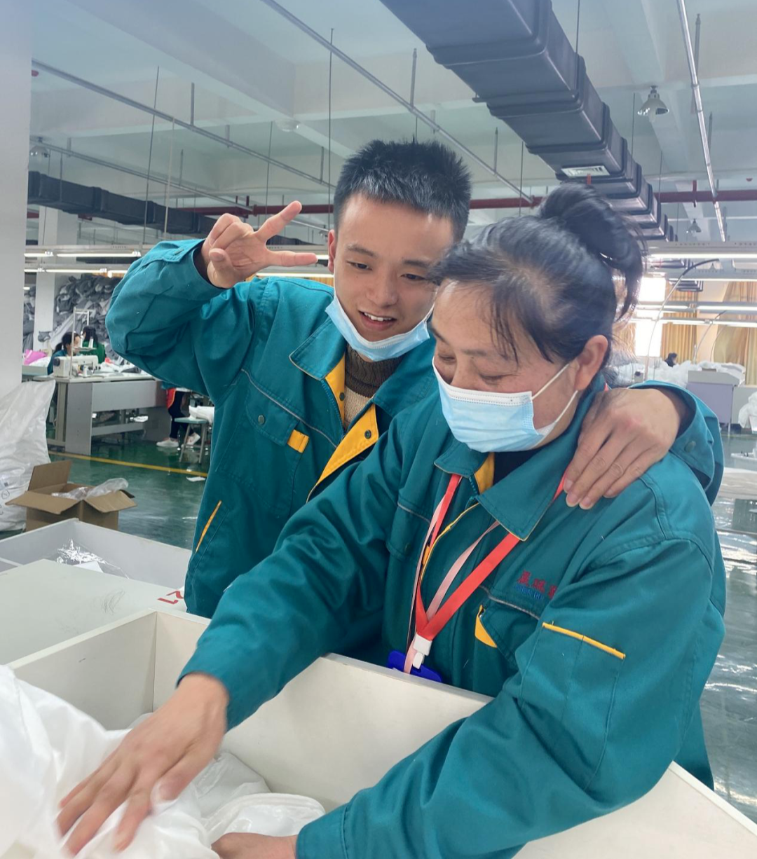 我叫任浩,妈妈叫王蓉,我们来自河南省淮滨县三空桥乡,我今年21岁,妈妈49岁,我还有两个姐姐,姐姐都在外地上班。我之前在郑州学了两年厨师,后来过年回家赶上疫情突发,就一直在家没有出去。因为妈妈在晨瑞纺织工作,自己在家没什么事情做就想着陪妈妈一起到晨瑞纺织上班,学习了两三天就开始上生产线了,感觉比较简单,所以很快就上手了。