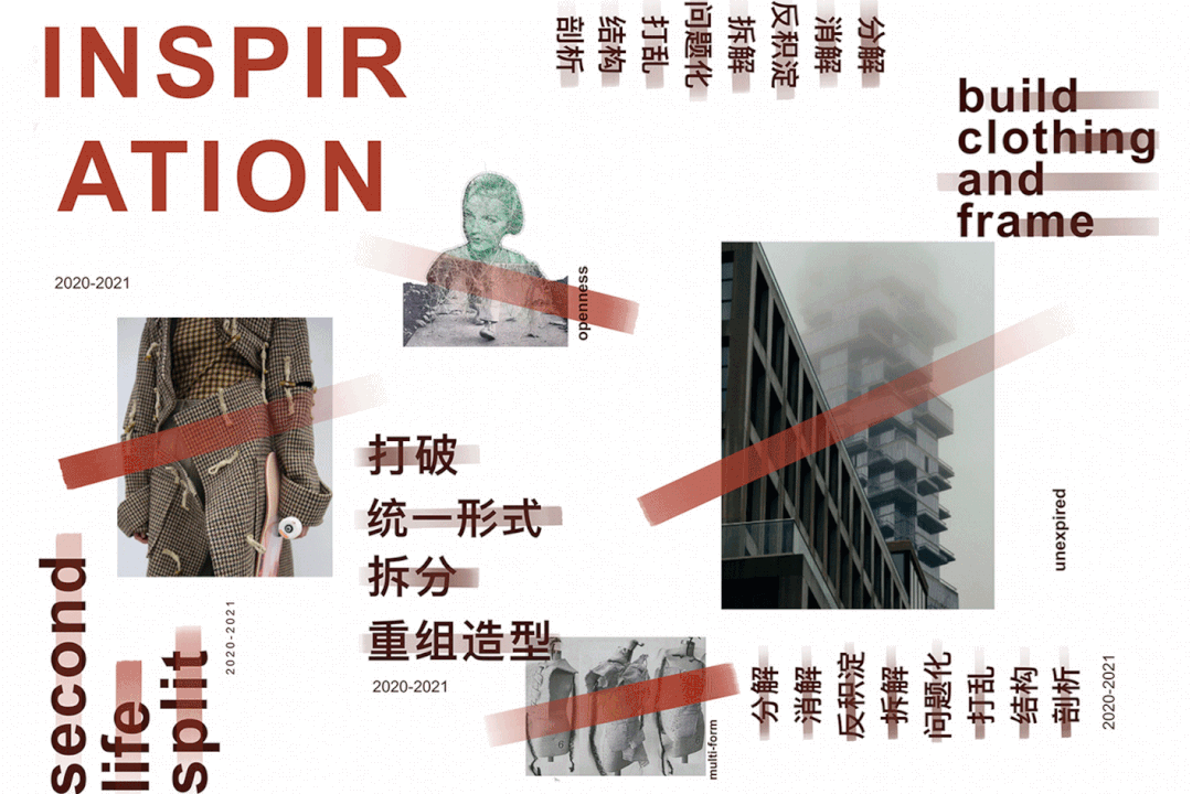 本次设计把这一理念融入服装设计作品之中,通过拆解,重组,错位等一系列解构手法,对衬衫和西装进行解构实验,从中记录实验过程,在实验中寻找服装形制,合理取舍保留创意造型,得到新的设计灵感,给一件平淡枯燥的服装注入新的生命。