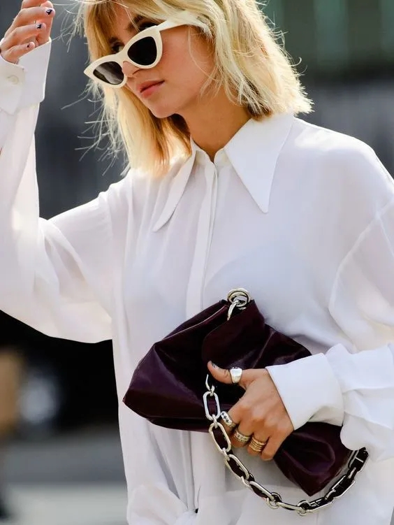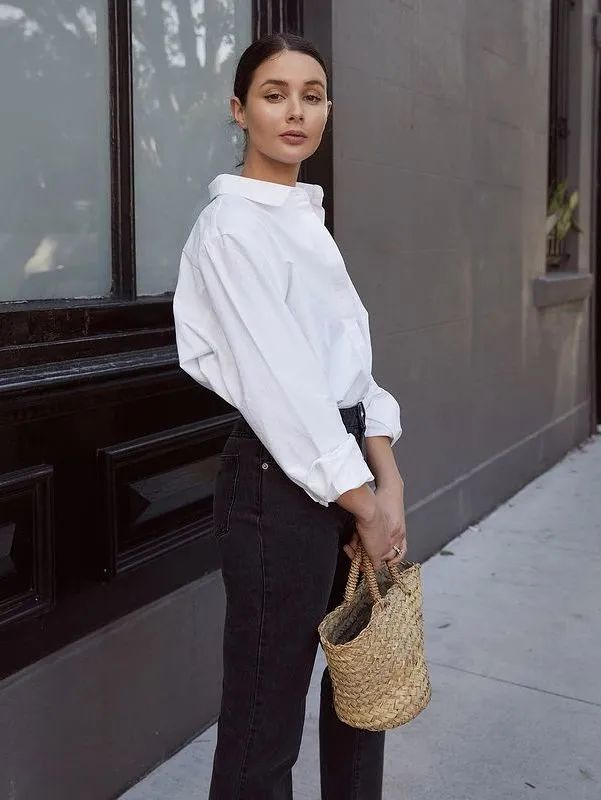 选择一件宽松版型的白衬衫,一条高腰裤。束进裤腰里的衬衫,会泛空气感,起到了遮肉显瘦作用。