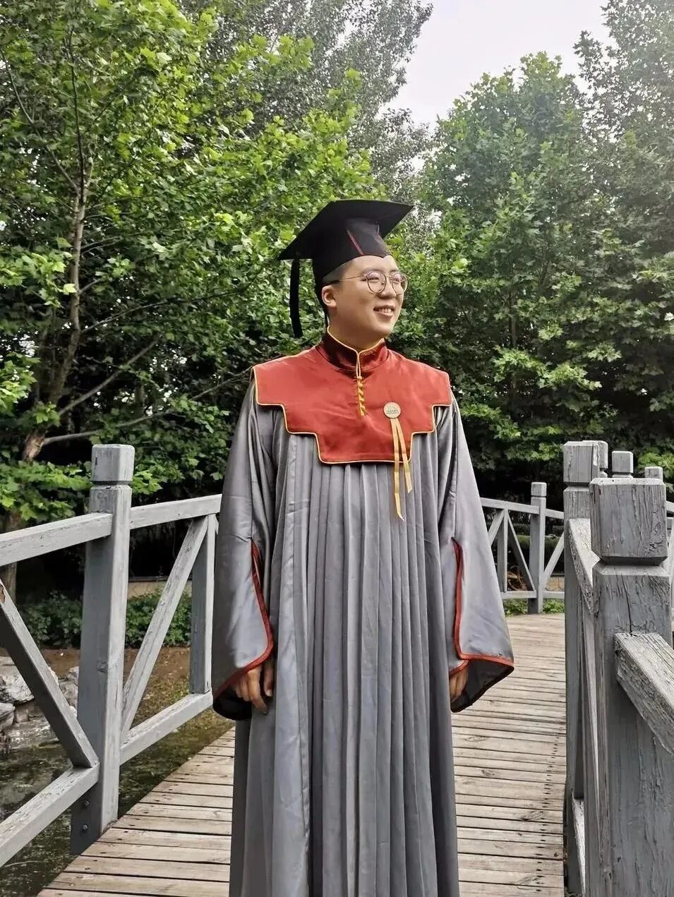 学位袍采用中式的立领和对襟